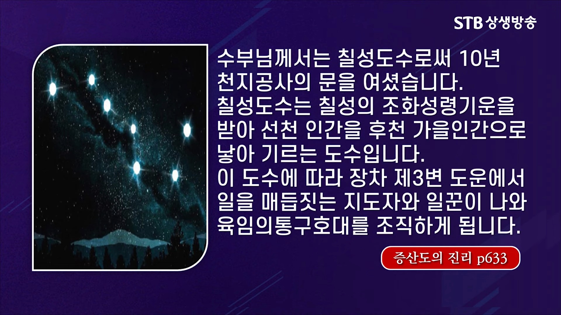 "상제님의 천지공사는 낳는 일이요, 나의 천지공사는 키우는 일이니라.", '칠성 공사는 후천 인간을 내는 공사요, 낳아서 키우는 공사니라. 후천 기운은 사람을 키우는 칠성 도수이니, 앞세상은 칠성으로 돌아가느니라."는 태모님의 말씀처럼 증산도 제3변 도운, 마지막 추수(秋收)도운을 매듭짓는 지도자와 일꾼을 나와서 후천대개벽을 극복하고 후천 조화선경을 열어나가는 천지공사를 집행하셨습니다.