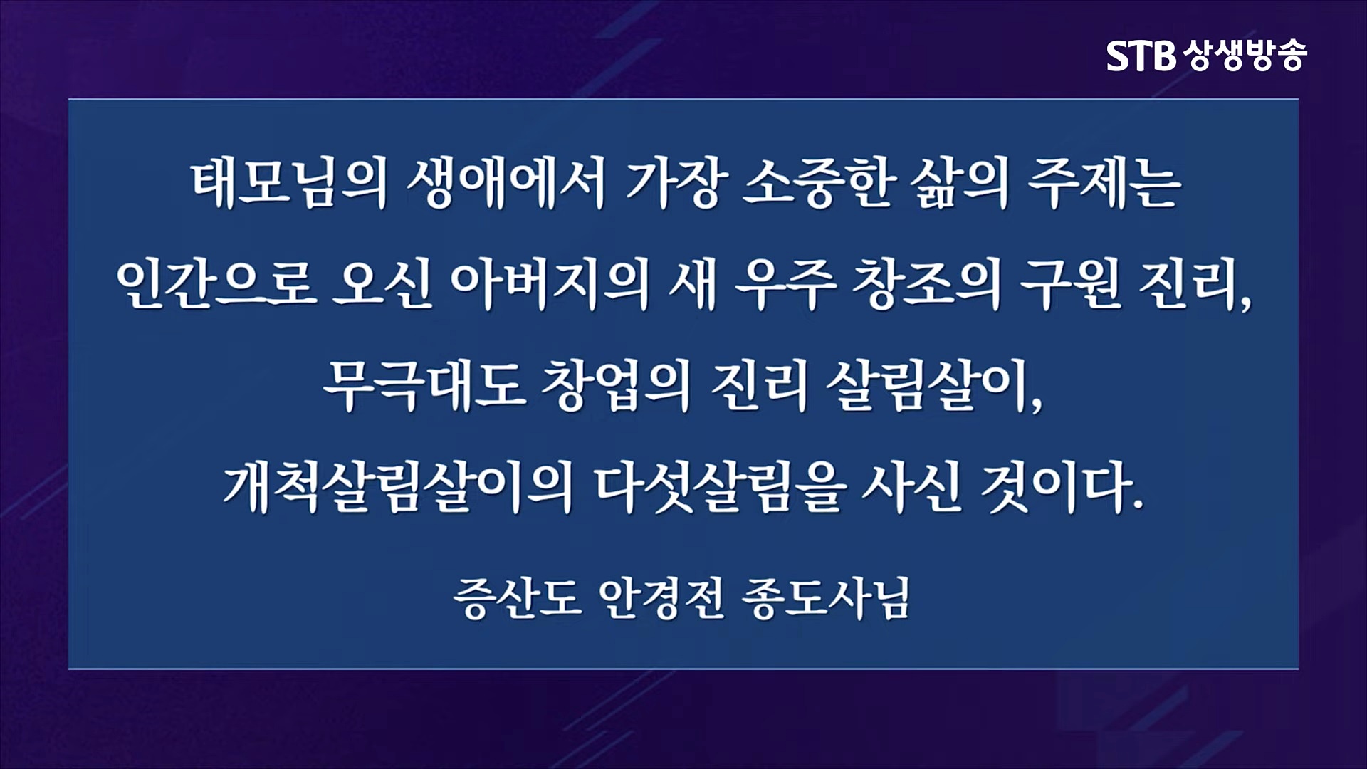 어머니 하나님이신 태모 고수부님께서 증산도 도문(道門)을 개창하시고, 세 번을 굽이쳐 이루어지는 '3변(變) 성도(成道)'의 이치에 따라 크게는 진리의 씨를 처음 뿌리는 낙종(落種)과 진리를 옮겨서 키우는 이종(移種)과 진리를 결실할 추수(秋收)의 주인을 내는 증산도 도운(道運)의 '크나큰 세 살림' 도수(度數)를 맡으셨습니다.