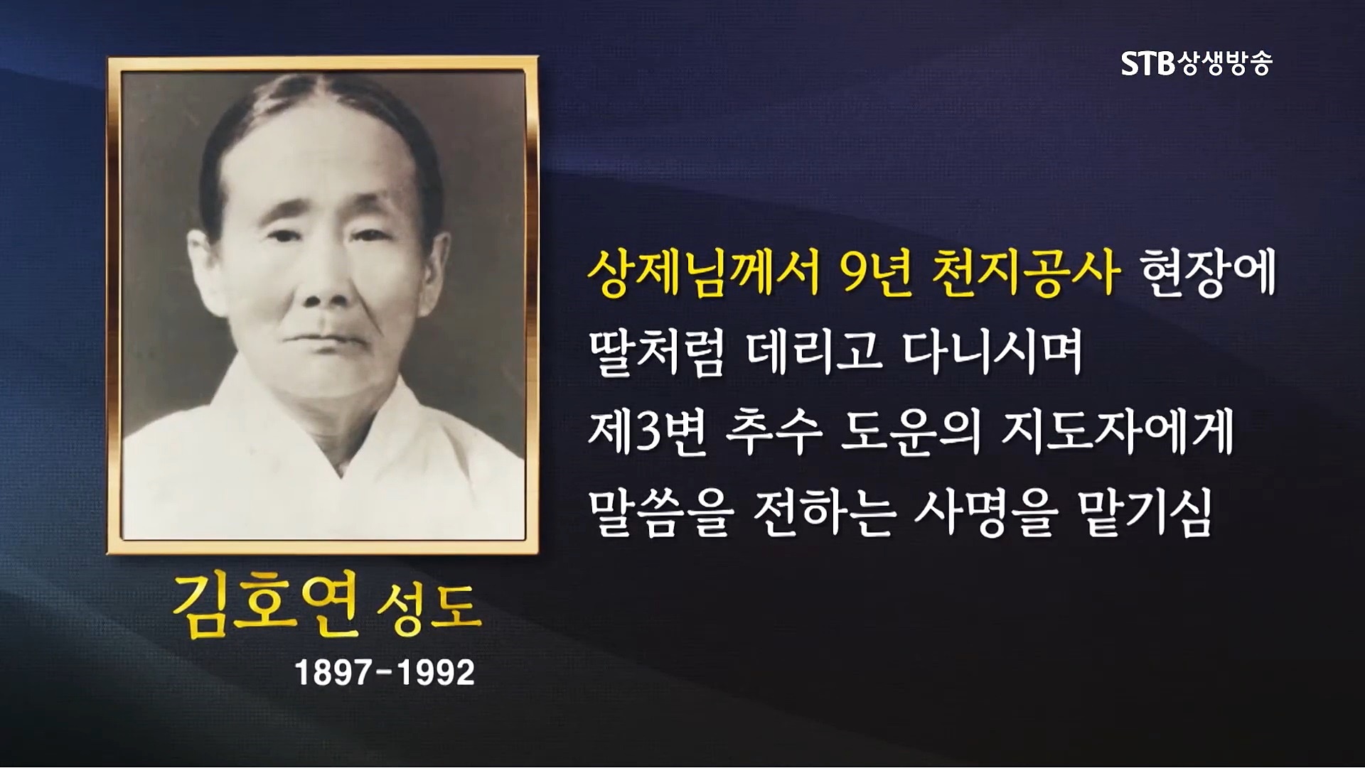 상제님께서 5살 때부터 데리고 다니며 천지공사를 참관시킨 김호연(1897~1992) 성도님은 만물의 참모습을 직접 봤습니다. 1905년 상제님께서 김호연 성도님을 125일 동안 직접 수행시켜 몸은 선체(仙體)가 되고 인간의 참마음인 순수감성의 문, 즉 영성(靈性)이 완전히 열려 천지 만물과 소통하고 신명(神明)들이 오고 가는 모습을 다 보았습니다.