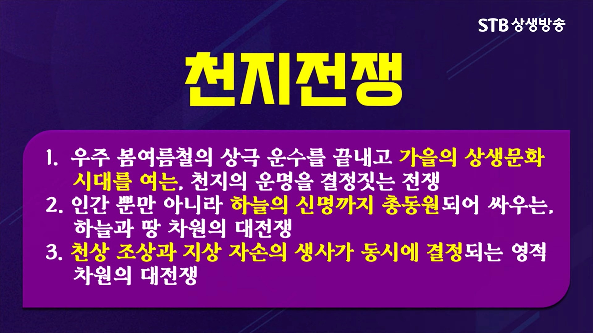 상제님께서는 "씨름판대는 조선의 삼팔선(三八線)에 두고 세계 상씨름판을 붙이리라."고 말씀하셨습니다. 한반도의 남북한 충돌을 넘어 선천 역사의 상극(相克) 정신과 역사상 모든 전쟁을 완전히 종식시키는 최후의 전쟁이며 자연개벽과 문명개벽과 인간개벽의 후천대개벽의 실제상황으로 들어가면서 천지의 운명을 결정짓는 천지전쟁, 우주 대전쟁입니다.