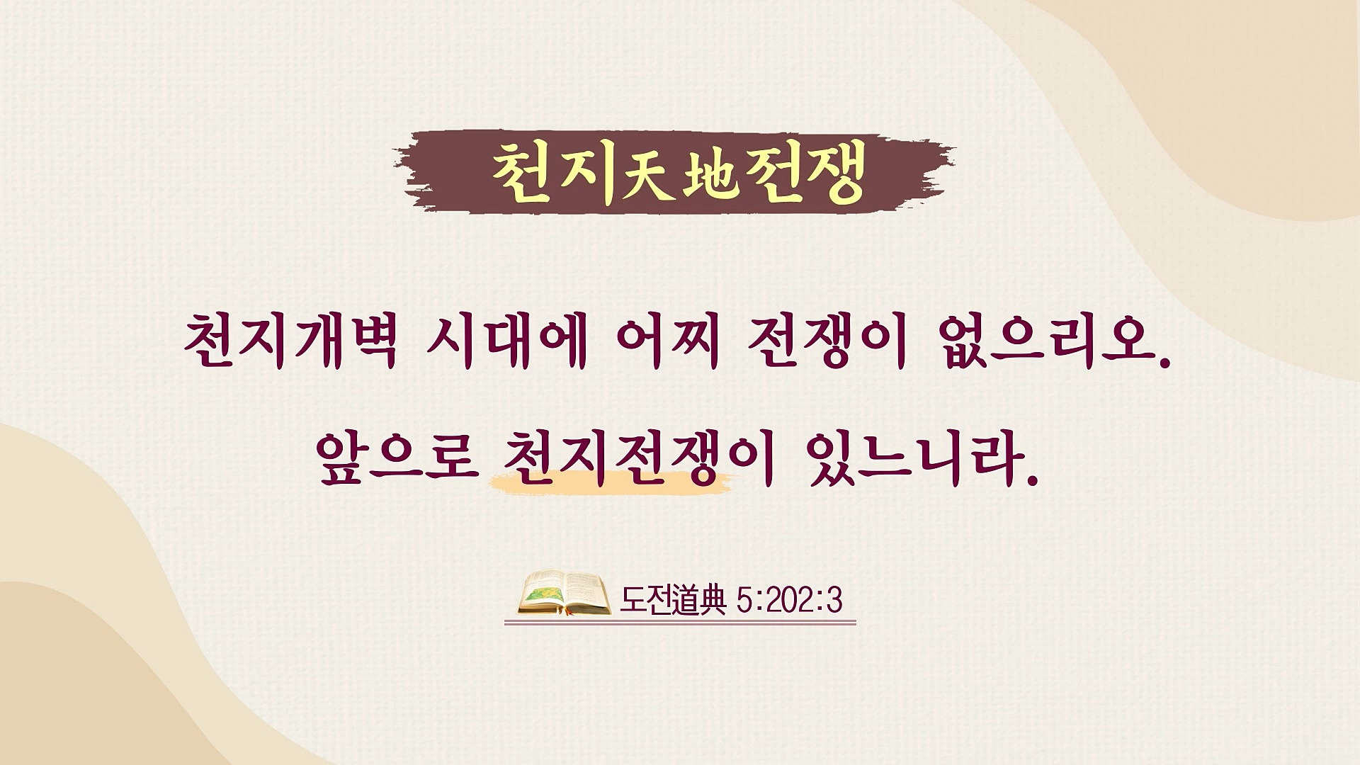 '인류 역사는 전쟁의 역사다.'라는 말처럼 지나온 역사에서 크고 작은 전쟁과 분쟁이 그칠 날이 없었습니다. 상제님께서는 "현하대세가 씨름판과 같으니 애기판과 총각판이 지난 뒤에 상씨름으로 판을 마치리라."고 말씀하셨습니다. 애기판과 총각판과 상씨름판으로 점점 판이 커지다가 '판을 마친다'라는 말씀처럼 전쟁의 역사, 선천의 상극 역사는 인간개벽의 괴질 병란(病亂)이 발생하면서 완전히 막을 내리게 됩니다.