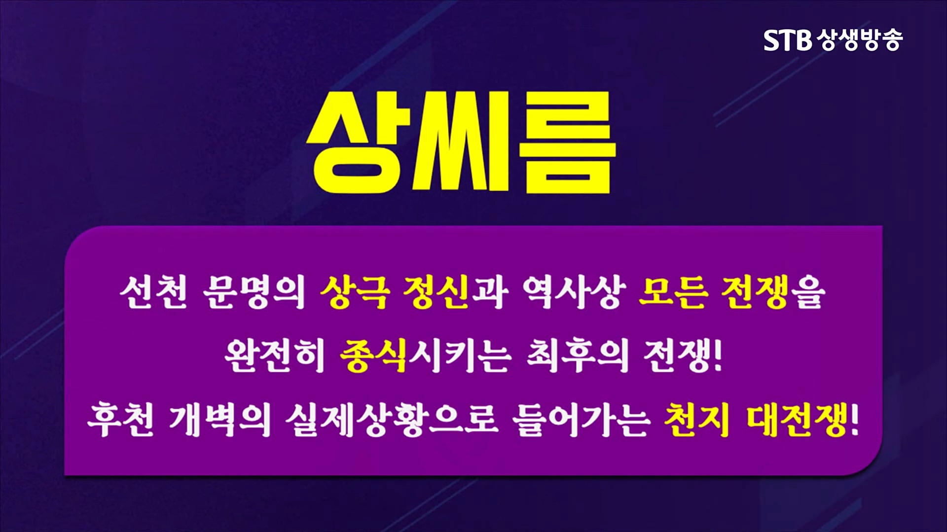 마지막 상씨름은 승자와 패자가 없는 인류 최후의 세계대전쟁입니다. 더 나아가 지상의 인간과 하늘의 신명까지 총동원되어 대결하는 천지전쟁, 즉 우주전쟁입니다. 또한 천상의 조상과 지상 자손이 생사(生死)가 동시에 결정되는 영적 차원의 대전쟁입니다. 다시 말해 하늘과 땅과 인간과 신(神)이 상극 질서에서 쌓이고 맺힌 모든 것을 해원(解寃) 하는 마지막 상극 전쟁입니다.