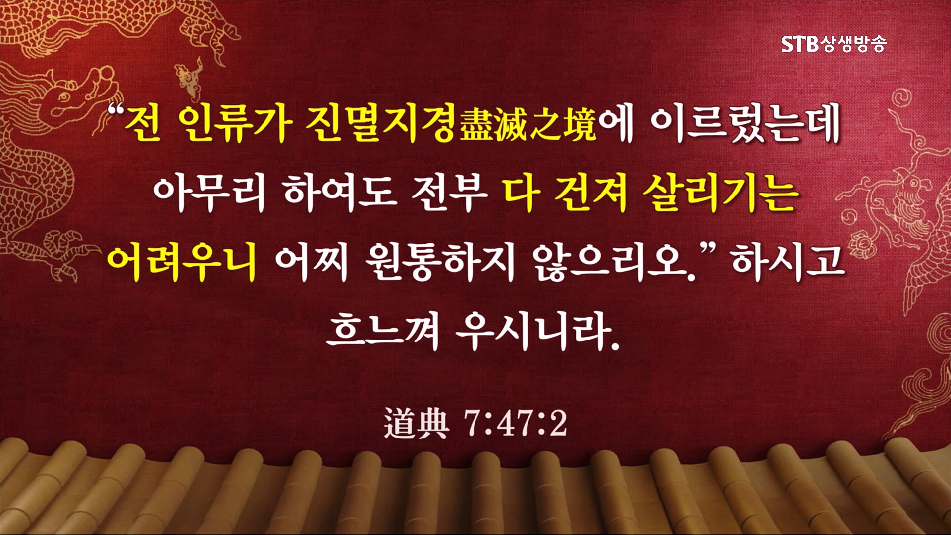 인류가 도덕과 윤리, 공정과 상식을 벗어날 것을 탄식하신 어머니 하나님이신 태모님께서는 "죄 없는 자가 없어 제 죄에 제가 죽게 되었다."라고 말씀하셨습니다. 상제님께서는 후천개벽이 눈앞에 다가왔건만 개인과 집단과 국가와 문명이 오직 이익만 추구하는 상황에 대하여 "천하창생이 진멸(盡滅)의 경계에 박도하였는데 조금도 깨닫지 못하고 이(利)끗에만 몰두하니 어찌 애석치 아니하리오."라고 절규하시며 대성통곡하셨습니다.