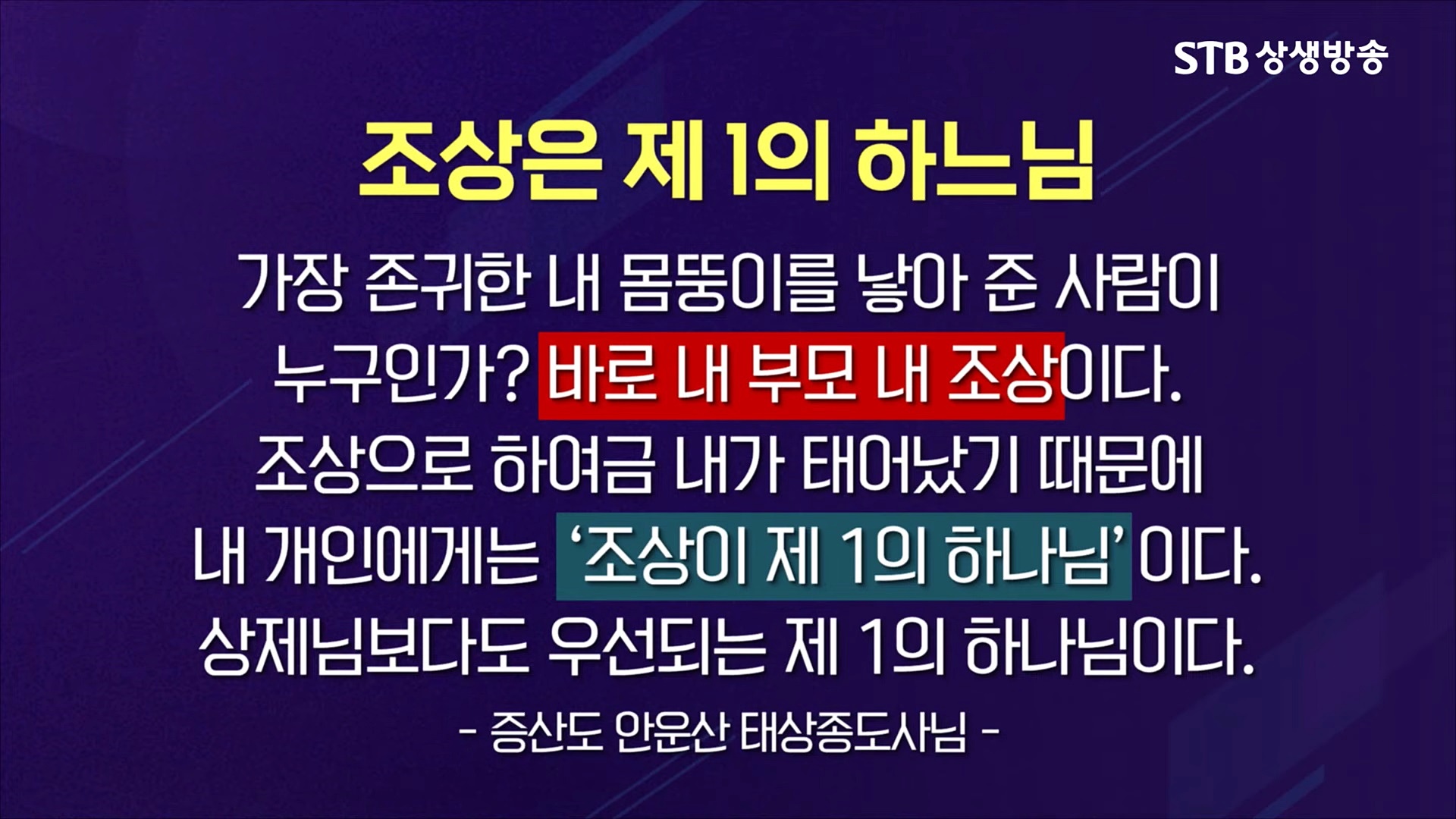 증산 상제님께서는 '조상 선령(先靈)의 음덕(蔭德)과 삼생(三生)의 인연'이 구원의 가장 큰 원동력이라고 말씀하셨습니다. 증산도 안운산 태상종도사님께서도 "지구상에 있는 전 인류는 제 조상이 자기의 하느님이다. 자기 조상이 제1의 하느님이고 진짜 하느님은 제2의 하느님이다."라고 말씀하셨습니다. 나의 부모님과 조상님이야말로 내 생명의 직접적인 뿌리요 나를 있게 한 조물주 하느님이라는 말씀입니다.