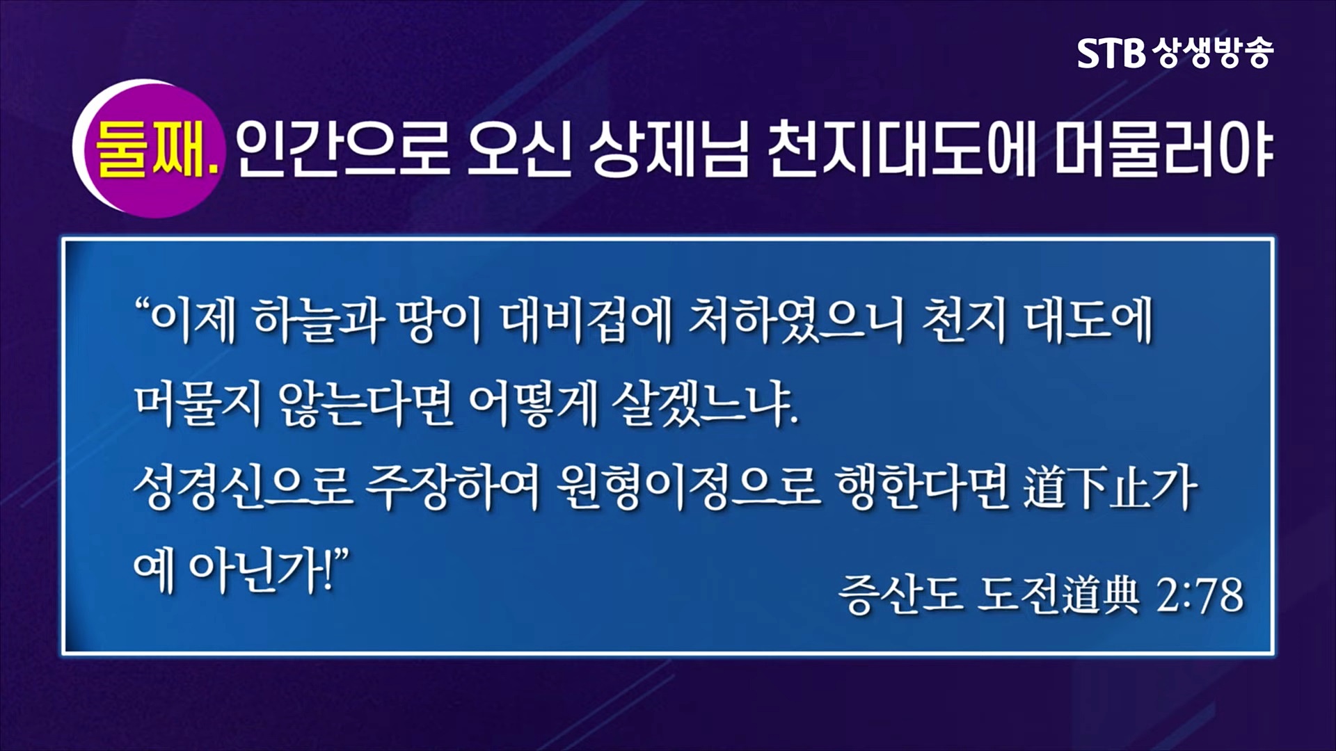 우주 통치자이신 상제님의 대도진리에 머문다는 것은 상제님 진리로 종교 장사를 하는 난법(亂法) 단체에 빠지지 않는 것도 중요합니다. 마지막 세 번째 가을개벽 심판에서 인종씨 추수의 요건은 조상 선령님을 부정하거나, 천지의 이치가 현실에 구현된 참된 역사와 정신문화를 부정하는 사람, 세상에 휩쓸리거나 게으르고 나태한 사람을 신천지 새 생명의 길로 들어서지 못하고, 참 진리에 목말라 있는 사람들이 구원받을 수 있습니다.