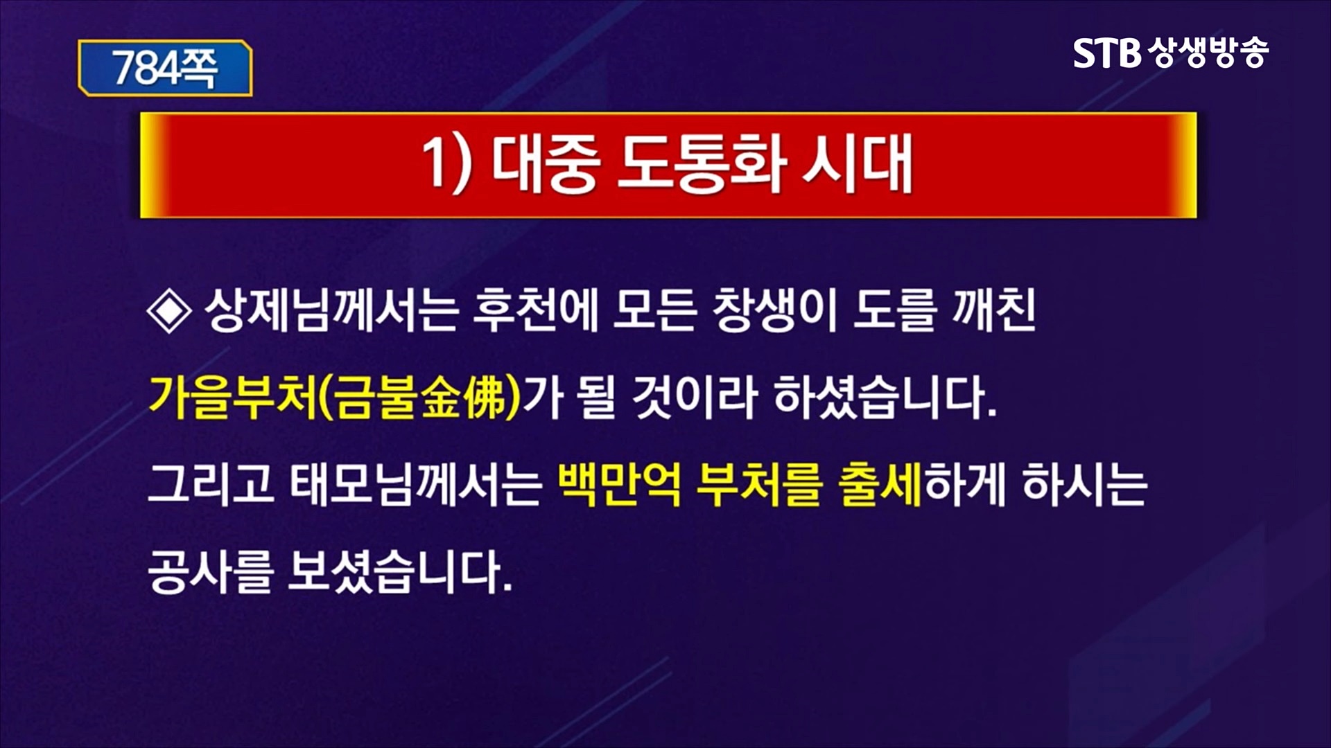 지구 1년의 가을철을 결실의 계절이라고 하듯 우주의 가을철은 닦은 바와 인류를 위한 희생과 봉사의 공덕(功德)에 따라 차등은 있을지라도 도통(道通)의 대중화 시대가 열리게 됩니다. 증산도 안운산 태상종도사님께서는 "사람이 하늘 노릇도 하고, 사람이 땅 노릇도 하고, 사람이 사람 노릇을 하는, 유형(有形)문화와 무형(無形)문화가 하나로 매듭지어진 알캥이 문화, 인존(人尊)문화 속에서 모든 사람이 천지의 대역자 노릇을 한다."라고 말씀해 주셨습니다.