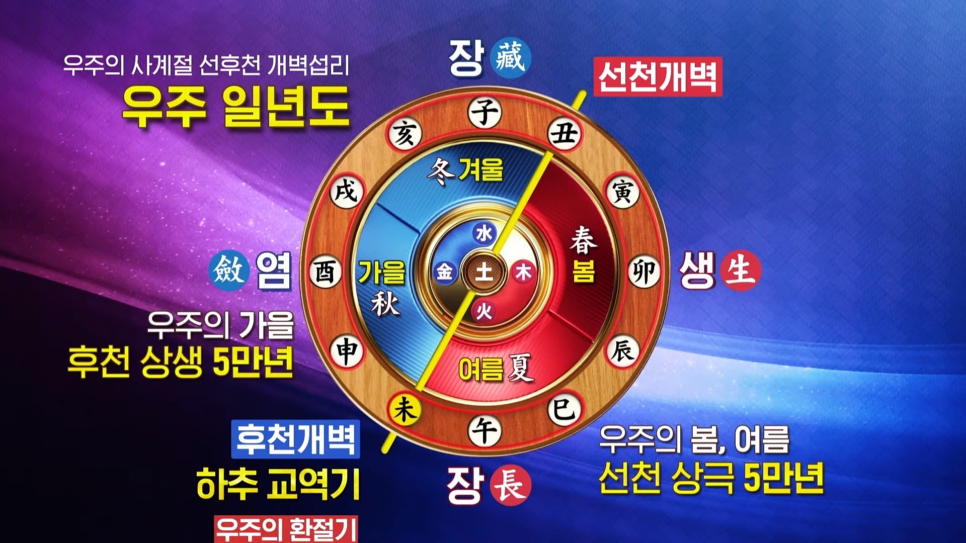 129,600년을 주기로 춘하추동(春夏秋冬) 4계절로 돌아가는 자연의 선천(先天)은 우주의 봄과 여름이며, 자연의 후천(後天)은 가을과 겨울입니다. 반면 인간과 문명 중심으로 말할 때 선천은 빙하기가 끝난 후부터 지금까지 약 5만 년의 우주의 봄과 여름 역사를 말하고, 후천(後天)의 가을우주는 인간농사와 문명농사를 결실하는, 인류 구원의 최종 목적을 달성하는 계절입니다.