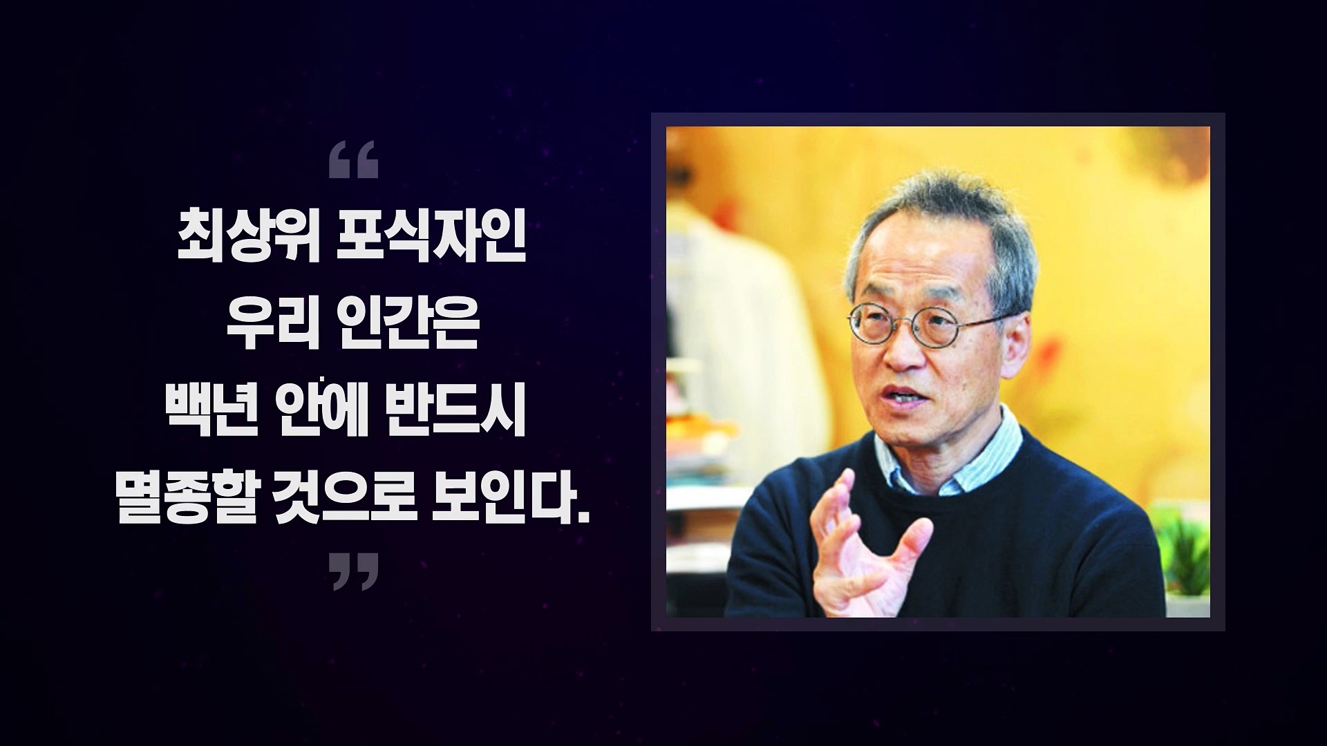 세계적인 생태학자이자 생물학자인 이화여대 최재천 석좌 교수는 "최상위 포식자인 우리 인간은 백년 안에 반드시 멸종할 것으로 보인다."라고 주장합니다. 대륙이동, 빙하기, 소행성과 운석 충돌, 해수면 하강, 화산 폭발 등 다섯 차례의 지구 대멸종의 역사는 자연적인 원인이었지만, 불과 200년 남짓 인간의 인위적인 활동에 의한 여섯 번째 대멸종이 시작됐다는 것입니다.