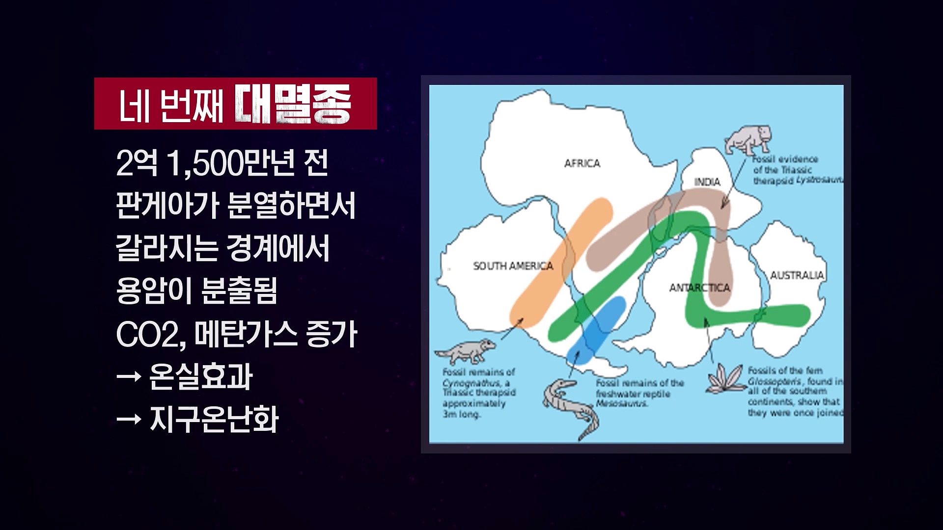 지구에서 일어난 다섯 번의 대멸종은 대륙이동, 빙하기, 소행성과 운석 충돌, 육지가 넓어지는 해수면 하강, 화산 폭발 등 자연적인 원인으로 발생한 것입니다. 과학계에서 여섯 번째 대멸종이 시작됐다는 이야기가 나오고 있습니다. 지난 다섯 번의 지구 대멸종의 역사가 여러 원인이 있지만, 큰 틀에서 보면 결과적으로 기후변화였습니다.