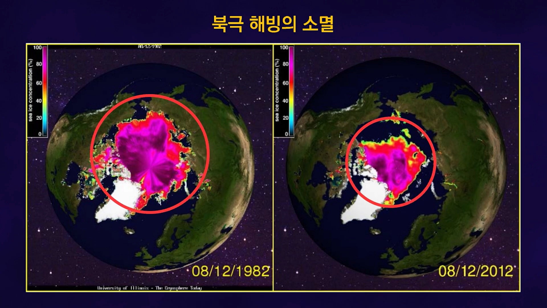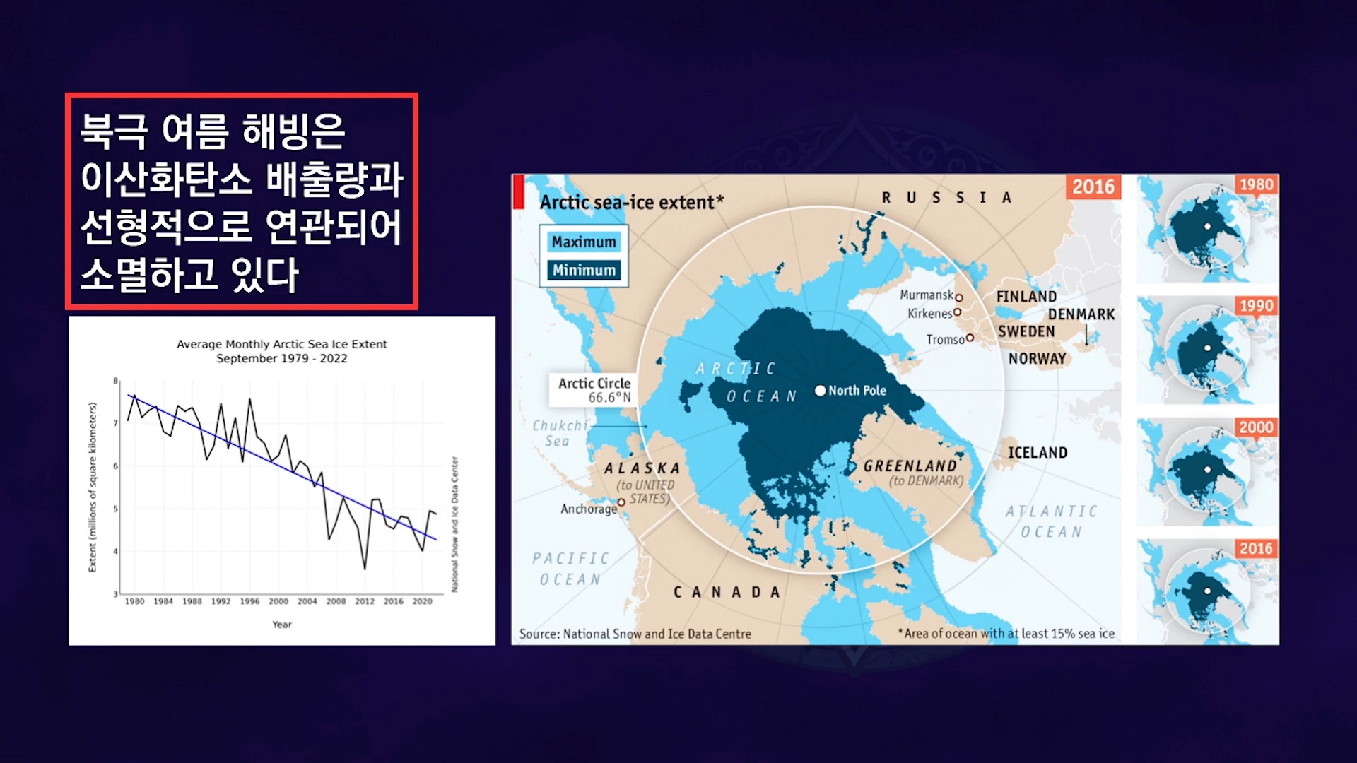 우리나라와 독일과 캐나다 공동연구팀은 지난 40여 년 동안의 빅데이터를 분석한 결과 현재 기준으로 빠르게 2023년 늦어도 2050년대에 들어서면 북극 빙하가 소멸할 것으로 확인했습니다. 공동연구팀은 빙하 소멸위기의 자연적인 원인은 미미할 정도였으며 환경파괴와 화석 연료 과다사용으로 인해 다량으로 방출된 온실가스의 영향이 컸다고 확인했습니다.