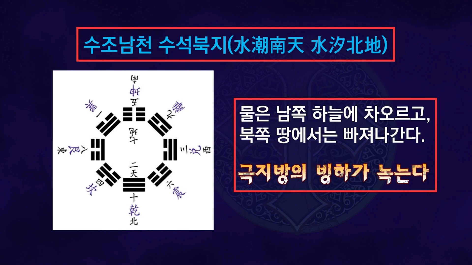 지금으로부터 약 180년 전 <정역正易>을 집필한 김일부 선생은 동양의 주역대계를 완성한 대성철(大聖哲)입니다. 김일부 선생은 의 '정역팔괘도(正易八卦圖)'에는 '이천칠지(二天七地)'라는 불(火)기운 팔괘도의 속으로 들어가 있습니다. 좀 어려운 이야기지만, 남방(南方)에 있는 7화(火)의 불기운이 북방(北方)의 2음화(陰火)를 만나서 빙하가 녹는 원인이 되면서 그 결과로 지진이 빈전하게 일어난다는 것입니다.