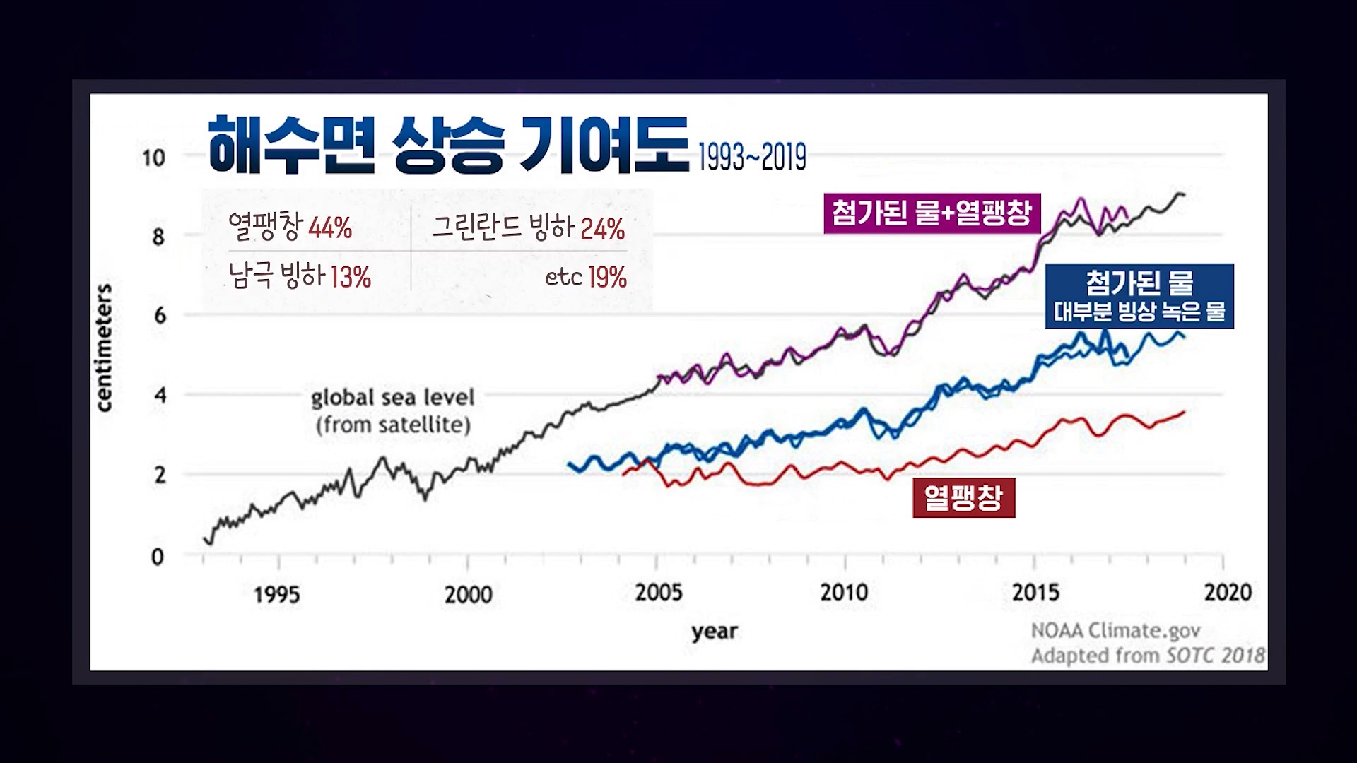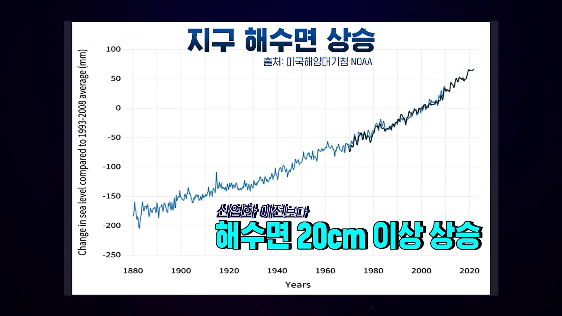 산업화 이전과 비교하면 약 20cm의 해수면이 상승한 것이지만, 불과 30년 만에 그 절반에 해당하는 약 10cm의 해수면이 상승한 것입니다. 불과 10cm, 20cm 남짓밖에 안 된다고 생각할지 모르겠지만, 지구에서 바다가 차지하는 면적을 생각한다는 어마어마한 양의 바닷물이 증가한 것입니다. 바다의 평균 수위는 시간이 지나면서 빠르게 올라가고 있고 피해는 점점 더 커집니다.