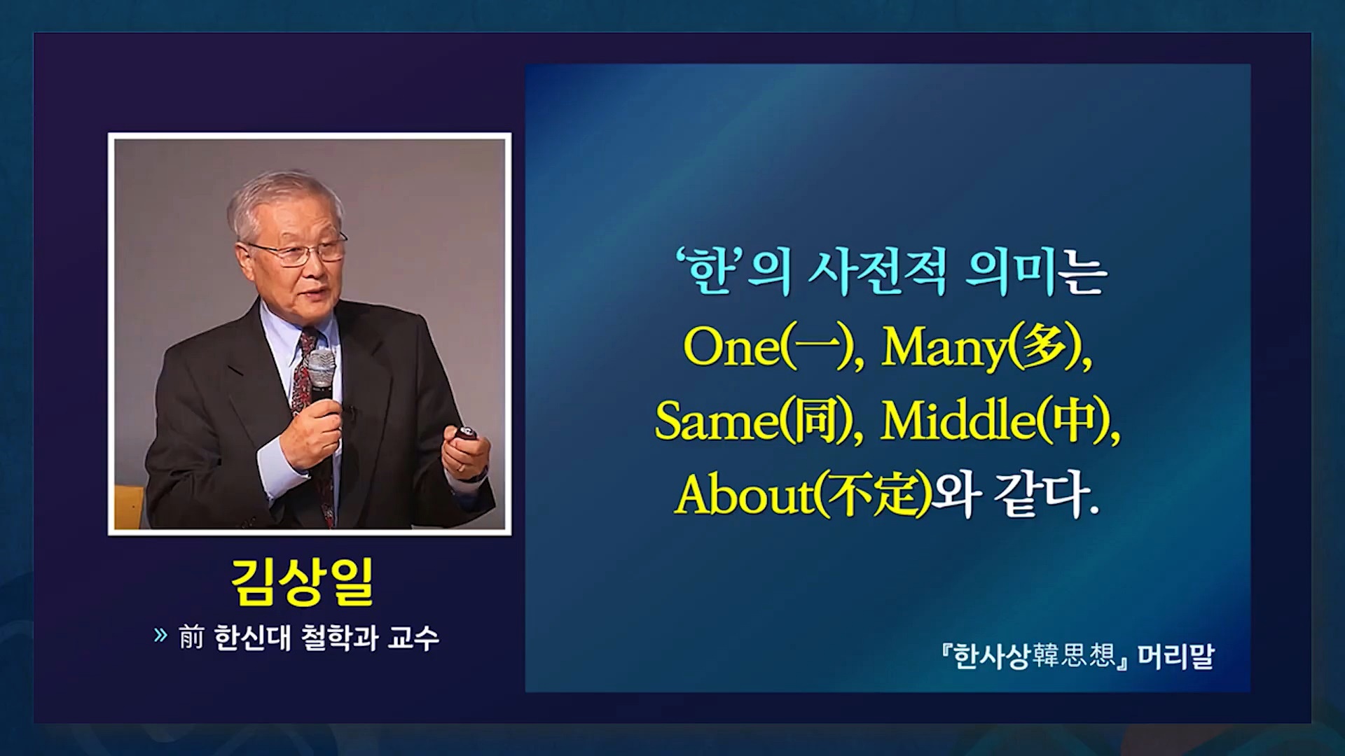 한(韓)민족의 고유정서로 알려진 한(恨)은 상극의 우주 질서가 인간과 문명을 낳고 기르기 위해 상극으로 돌아가면서 오랜 세월 동안 고통과 시련의 상극적인 인류 문명에 살게 되면서 모든 인간의 마음속에 있는 보편적 정서입니다. 마음 심(心)과 그칠 간(艮)이 합쳐진 한(恨)은 위에서 언급했듯이 인류 역사의 비밀을 담고 있습니다.