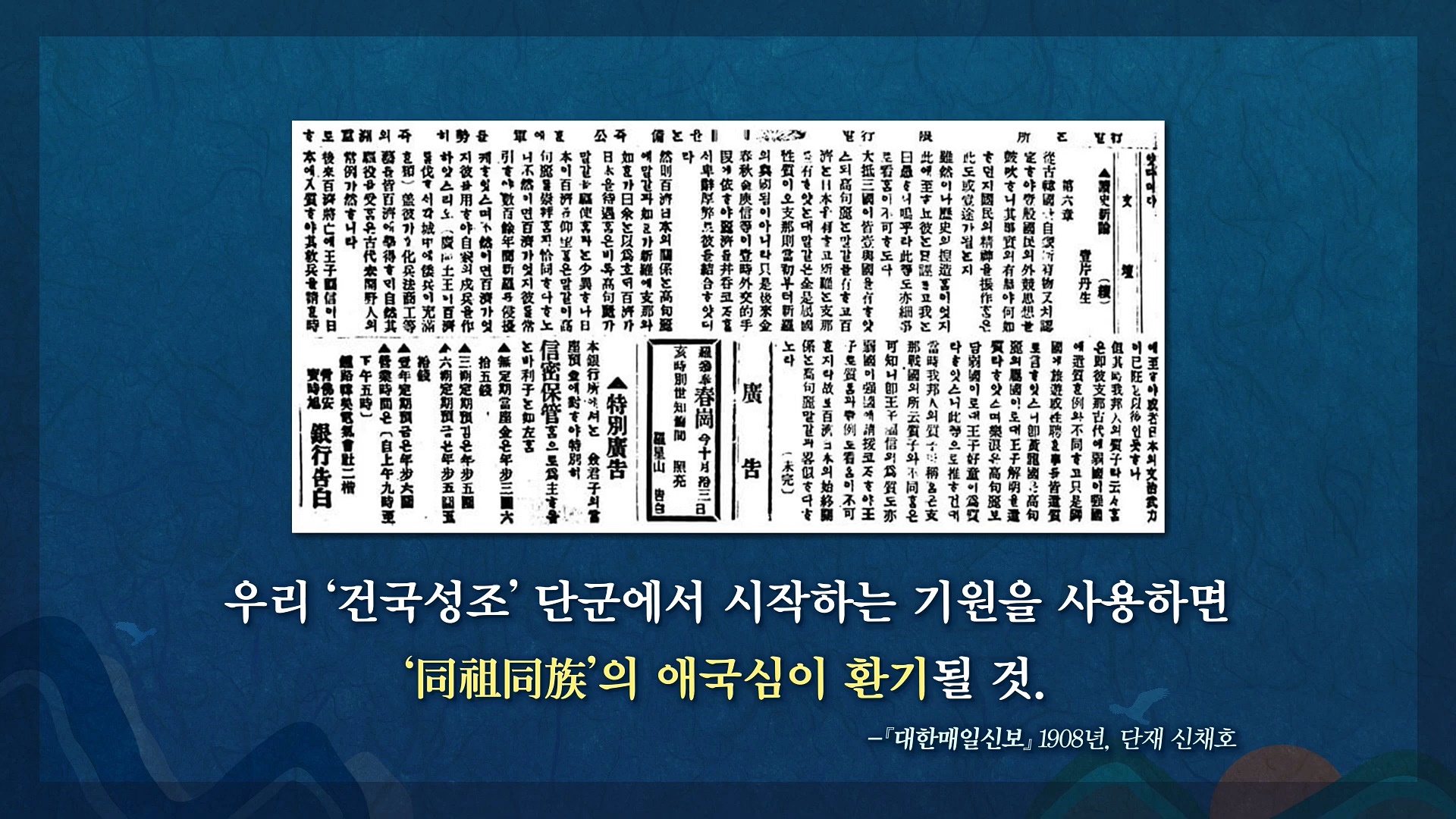 우리가 단군기원을 사용하기 시작한 것은 20세기 초부터입니다. 19세기 말부터 본격화된 일본 제국주의의 불의한 침략에 맞서 국가에 대한 애국심 고취와 민족의 단결을 모색하기 위한 것으로 보고 있습니다. 그러나 불과 몇 년이 지나 나라를 송두리째 빼앗긴 1910년 경술국치 이후 해방을 맞은 1945년까지 일본 왕의 이름인 명치(明治), 대정(大正), 소화(昭和) 연호가 사용됐습니다.