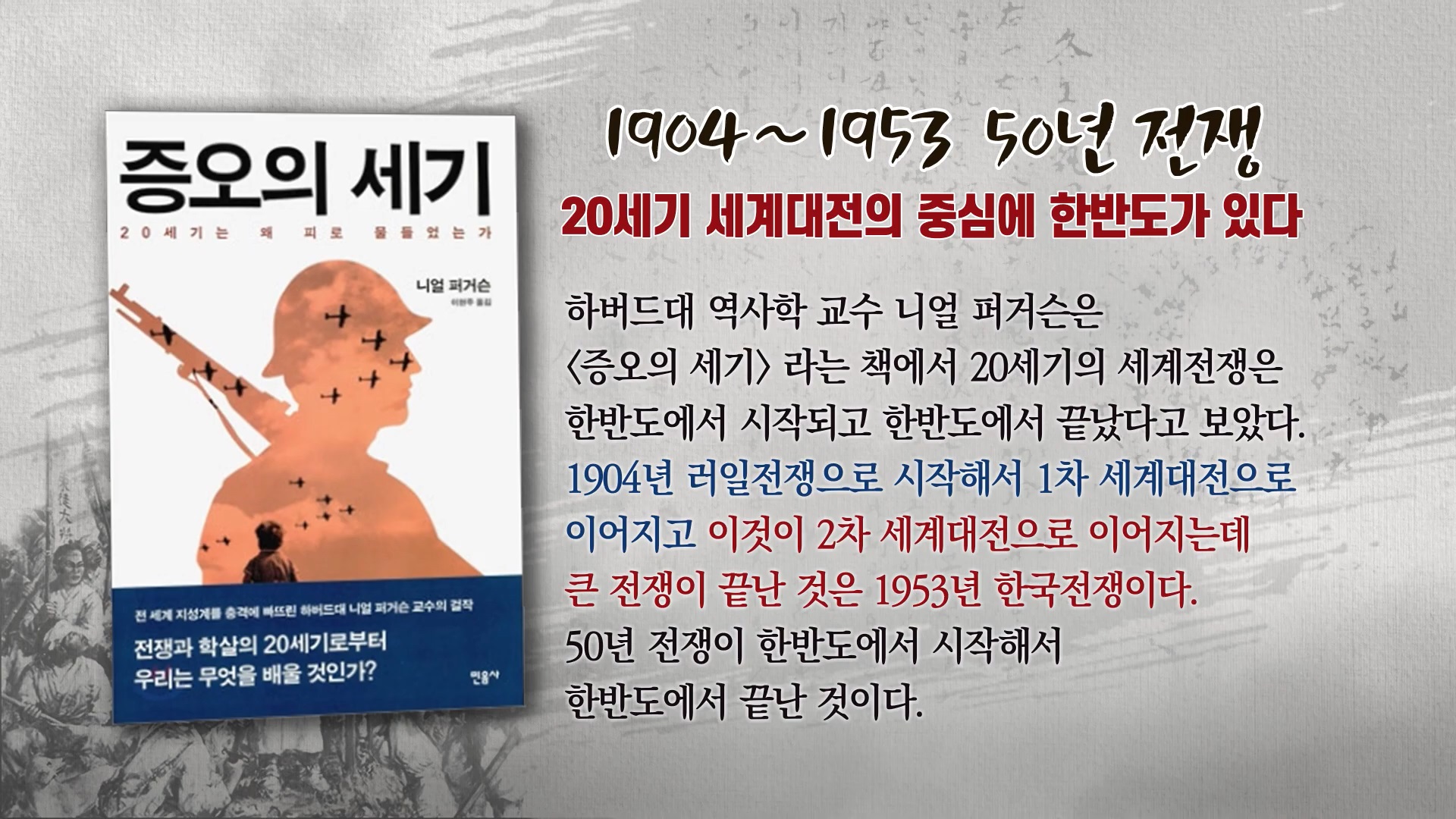 인류 역사상 가장 규모가 크고 가장 참혹한 두 전쟁은 20세기에 일어났습니다. <증오의 세기>의 저자 니얼 퍼거슨은 역사적 대사건인 1차 세계대전과 2차 세계대전은 한반도 지배권을 둘러싼 러일전쟁에서 시작되어 남북한이 맞붙어 역사상 가장 많은 국가가 참전하고 지원한 한국전쟁의 휴전협정 체결되면서 한반도에서 끝난 것으로 보고 있습니다.