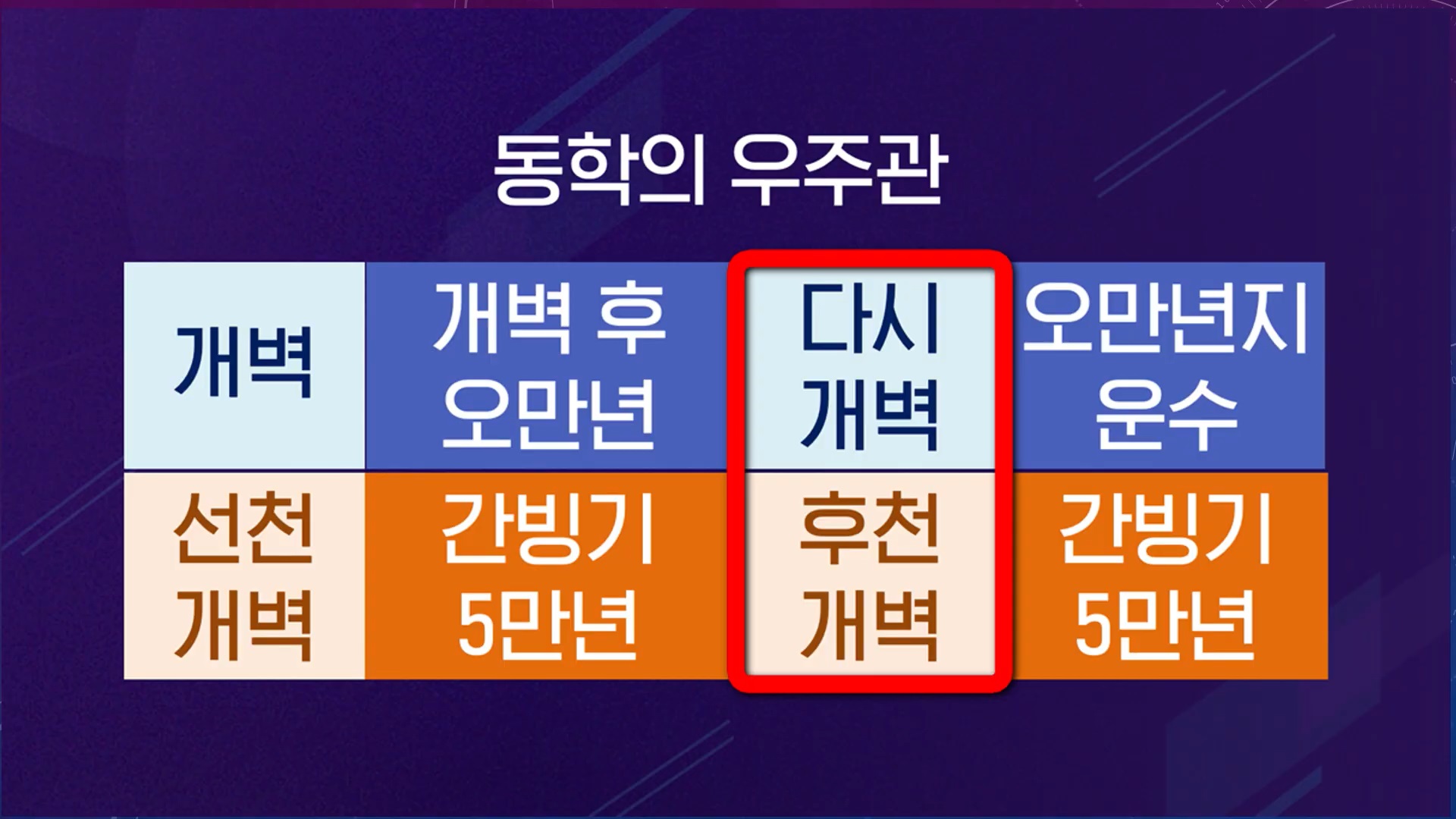 놀라운 사실은 동학의 우주관과 시간관은 빙하기와 간빙기 대주기뿐만 아니라 과학이 주장하는 약 5만 년 전 현생 인류가 출현했다는 주장과 일치합니다. 동학 경전은 "개벽 후 오만년에 네가 또한 첨이로다."와 "무극대도 닦아내니 5만년지 운수로다."라는 말씀처럼 지나온 선천(先天) 5만 년 세상과 다가올 후천(後天) 5만 년 세상을 말하고 있습니다.