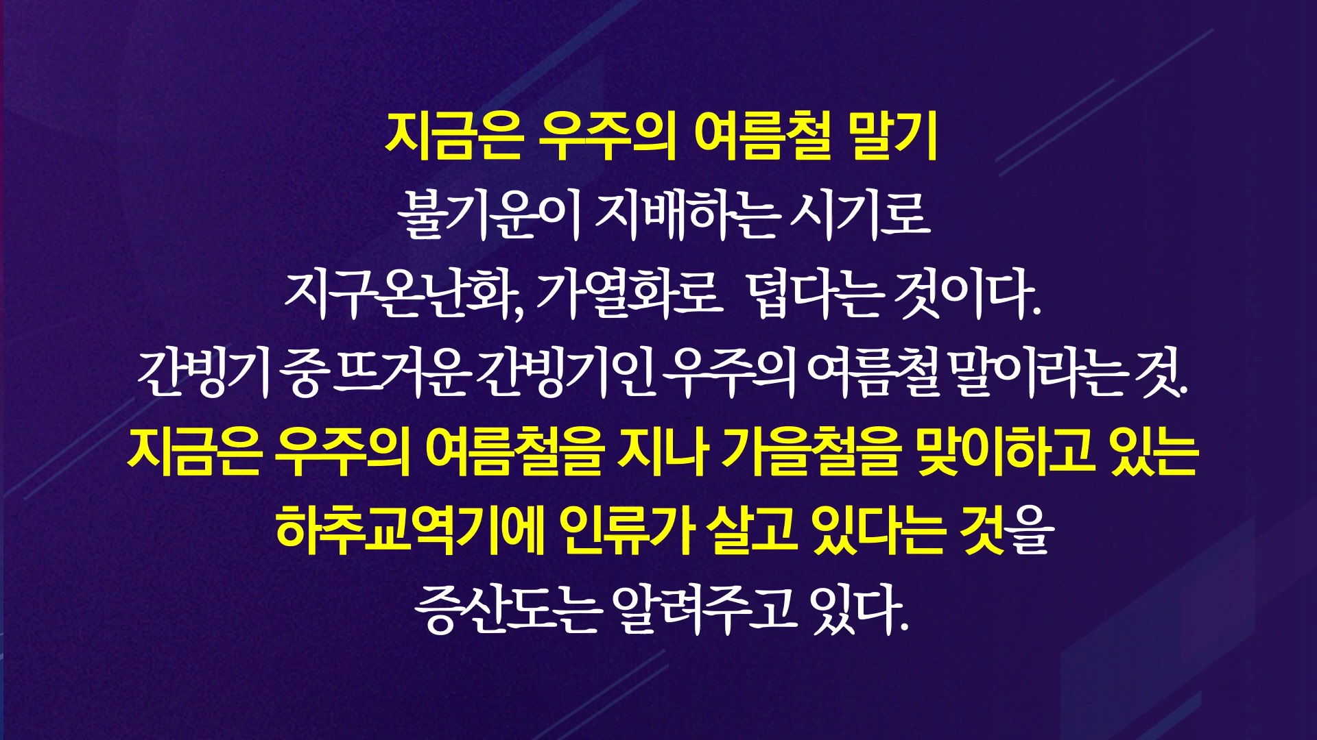 현대과학이 최첨단 문명을 일구었다고 하지만, 해수면 상승의 두 가지 요인을 절대 해결할 수 없으며 해빙 속도는 예상보다 무서운 속도로 빠르게 가속화하고 있습니다. 160여 년 전 수운 최제우 대신사는 우주 통치자이신 상제님으로부터 천명(天命)과 신교(神敎)를 받고 동학을 창시하면서라는 새로운 세상, 새 시대를 선언했는데, 동학의 우주관과 시간관을 볼 수 있습니다.
