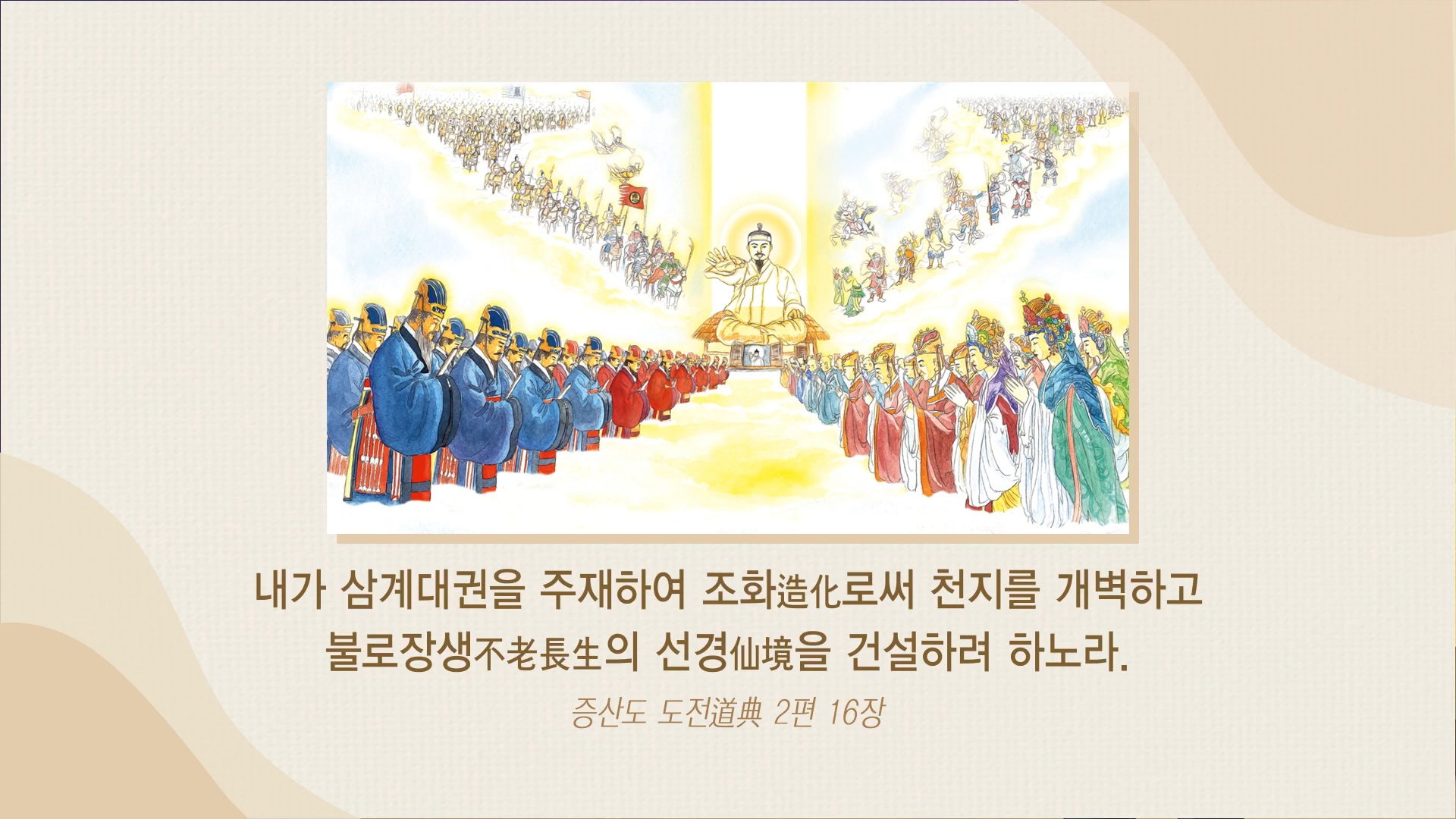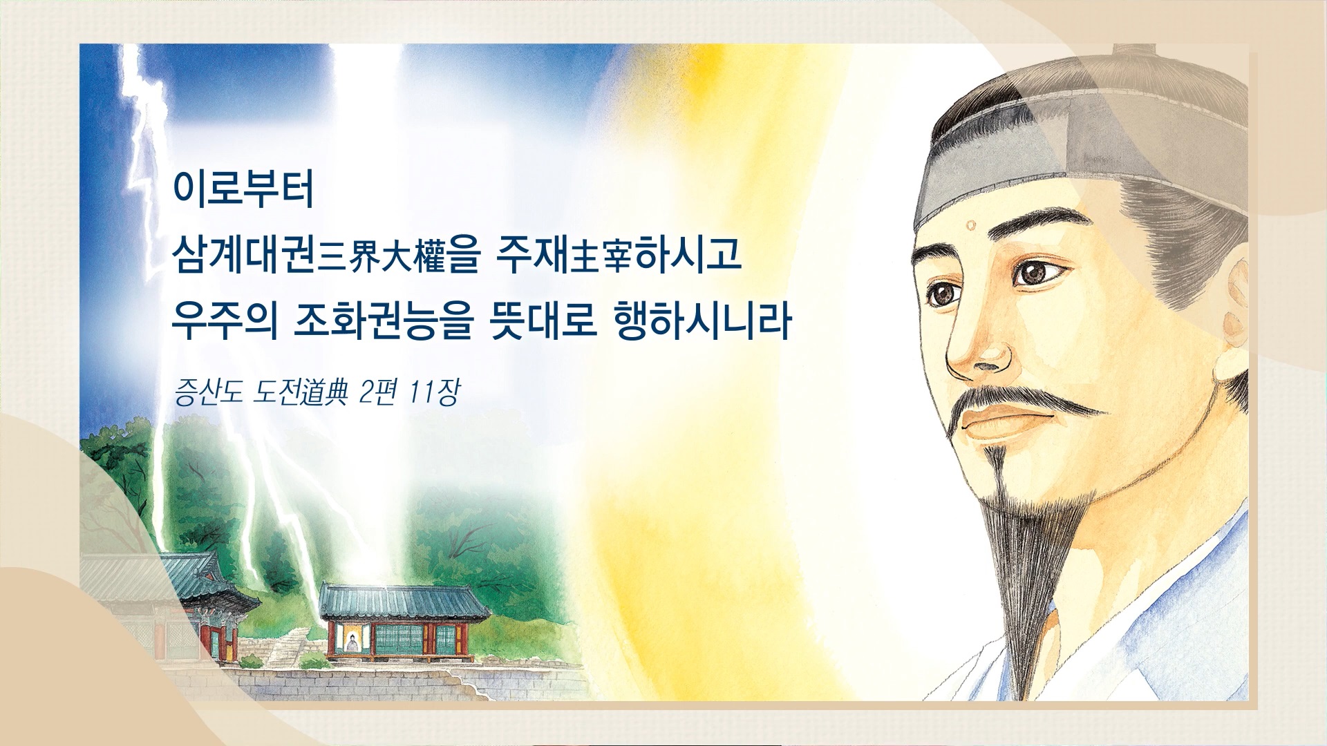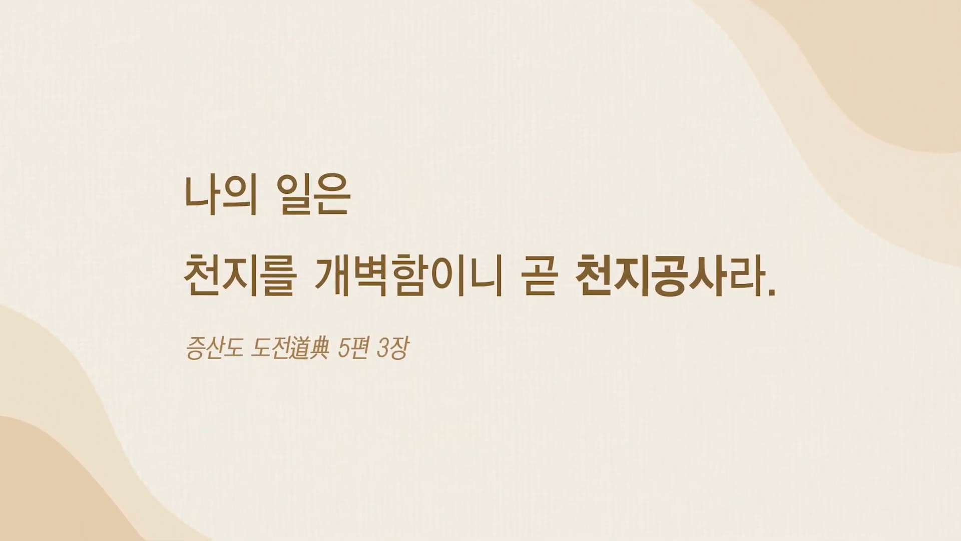 "현하의 천지대세가 선천은 운(運)을 다하고 후천의 운이 닥쳐오므로 내가 새 하늘을 개벽하고 인물을 개조하여 선경세계를 이루리니 이때는 모름지기 새판이 열리는 시대니라. 이제 천지의 가을운수를 맞아 생명의 문을 다시 짓고 천지의 기틀을 근원으로 되돌려 만방(萬方)에 새기운을 돌리리니 이것이 바로 천지공사니라."는 말씀처럼 인간으로 오신 상제님께서 하신 일은 새로운 질서가 열리도록 천지를 뜯어고치는 천지개벽 공사입니다.