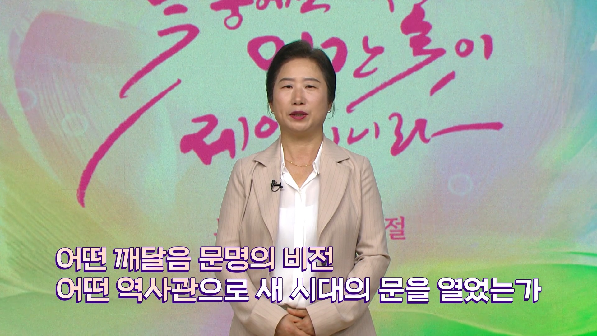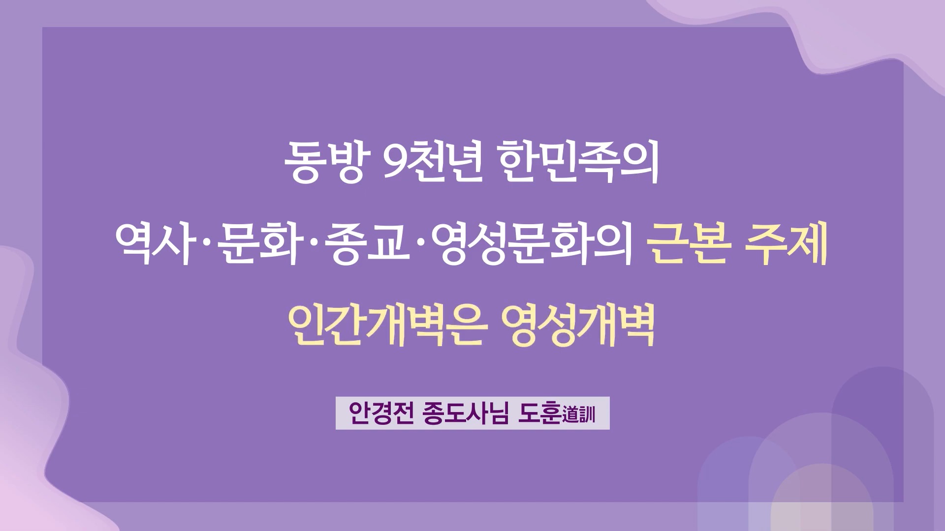 개벽은 우주가 열린 이래 언제나 매 순간 살아 움직이는 현실이며 우주 만유의 미래입니다. 인류는 머지않아 자연개벽과 문명개벽과 인간개벽이 동시다발적으로 일어나는 후천개벽을 맞이하게 됩니다. 이제 깊이 잠들어 있는 영성을 깨우는 인간개벽을 통해 미몽(迷夢)에서 깨어나 어두운 역사의 블랙홀을 깨고 미래의 새로운 문명을 여는 우주광명의 역사 화이트홀로 개벽해야 한다.