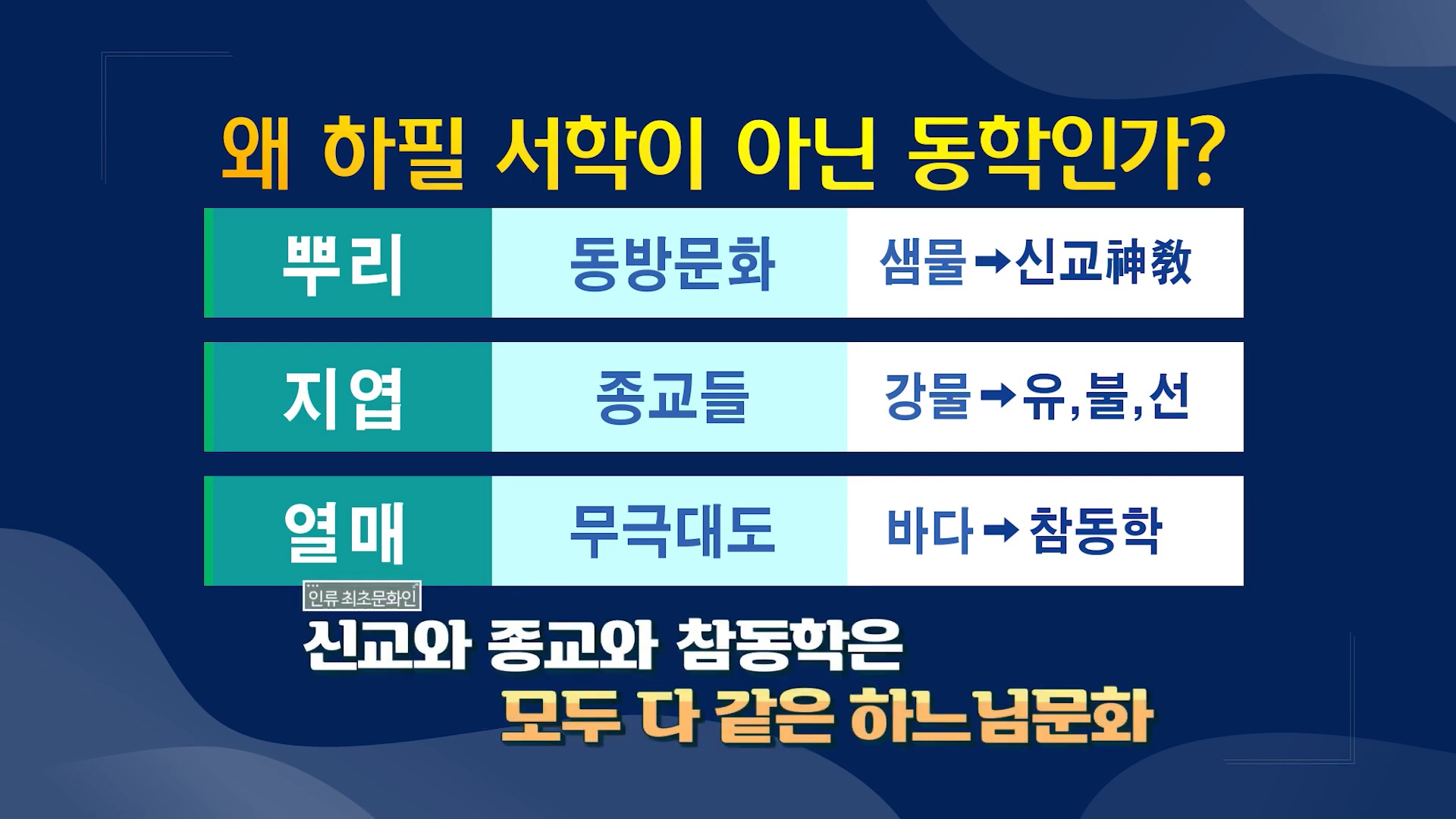 분화되고 세분되었던 다양한 학문의 칸막이를 없애고 융합한 결과 빅히스토리라는 학문으로 지구와 우주의 역사를 종합적이고 구체적으로 바라볼 수 있게 됐듯 동서양에 흩어져있는 종교 문화의 공통된 목적을 알 수 있는 것입니다. 현재 동서양의 종교는 약 1만 년 전 인류 창세 역사 시대의 원형문화에서 분화된 것입니다.
