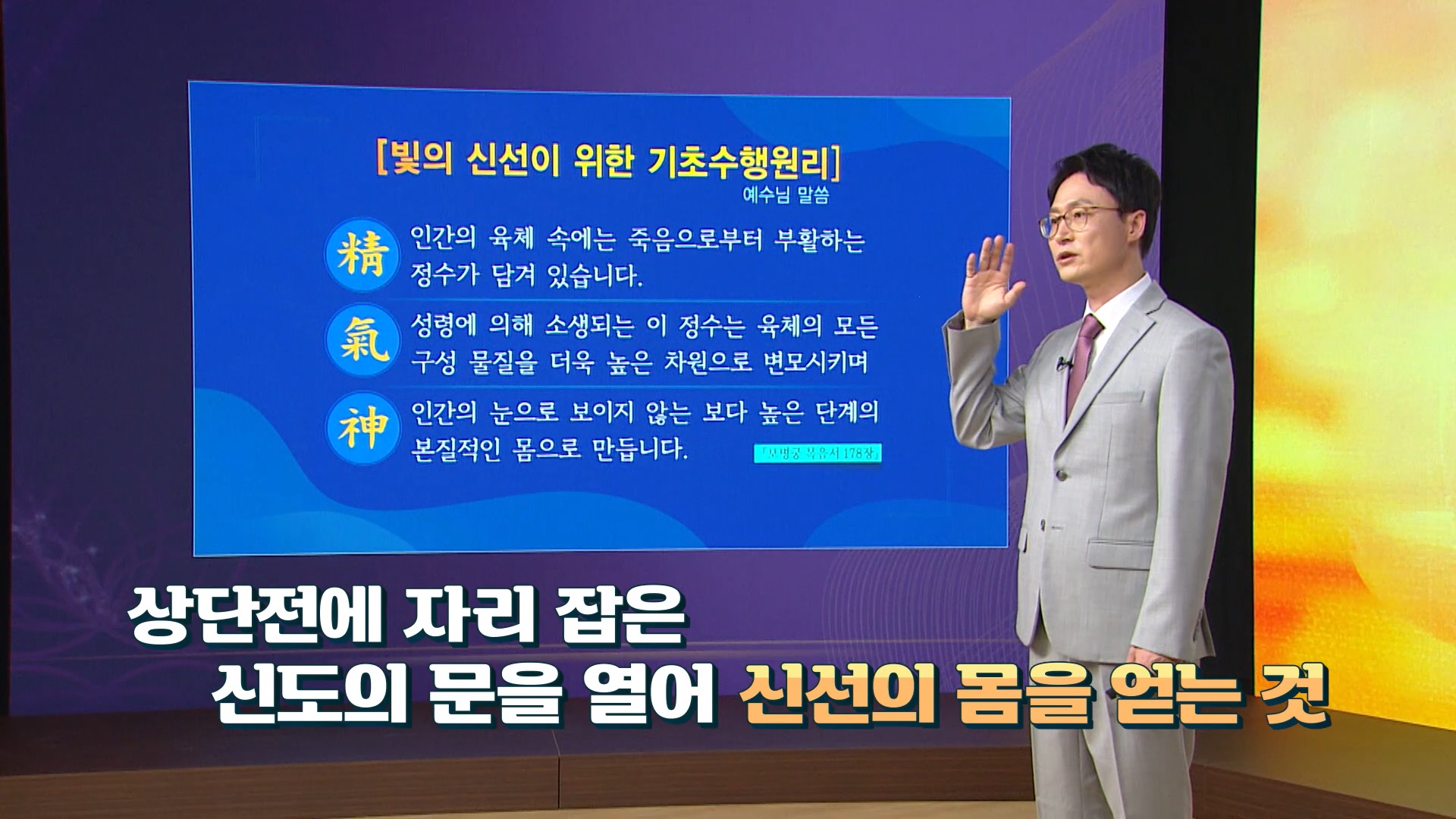 이처럼 도교와 불교와 힌두교 경전은 공히 수행을 통해 우주광명과 하나 된 인간, 빛의 인간, 빛의 인류가 출현한다는 소식을 전합니다. 기독교 마태복음의 '아버지의 나라에서 해와 같이 빛나리라'는 말씀과 요한복음의 '하나님의 나라에 들어가기 위해서 필요한 물과 성령으로 거듭남'의 비밀은 빛의 인간이 되어야 하나님의 나라에 들어갈 수 있다는 말입니다.
