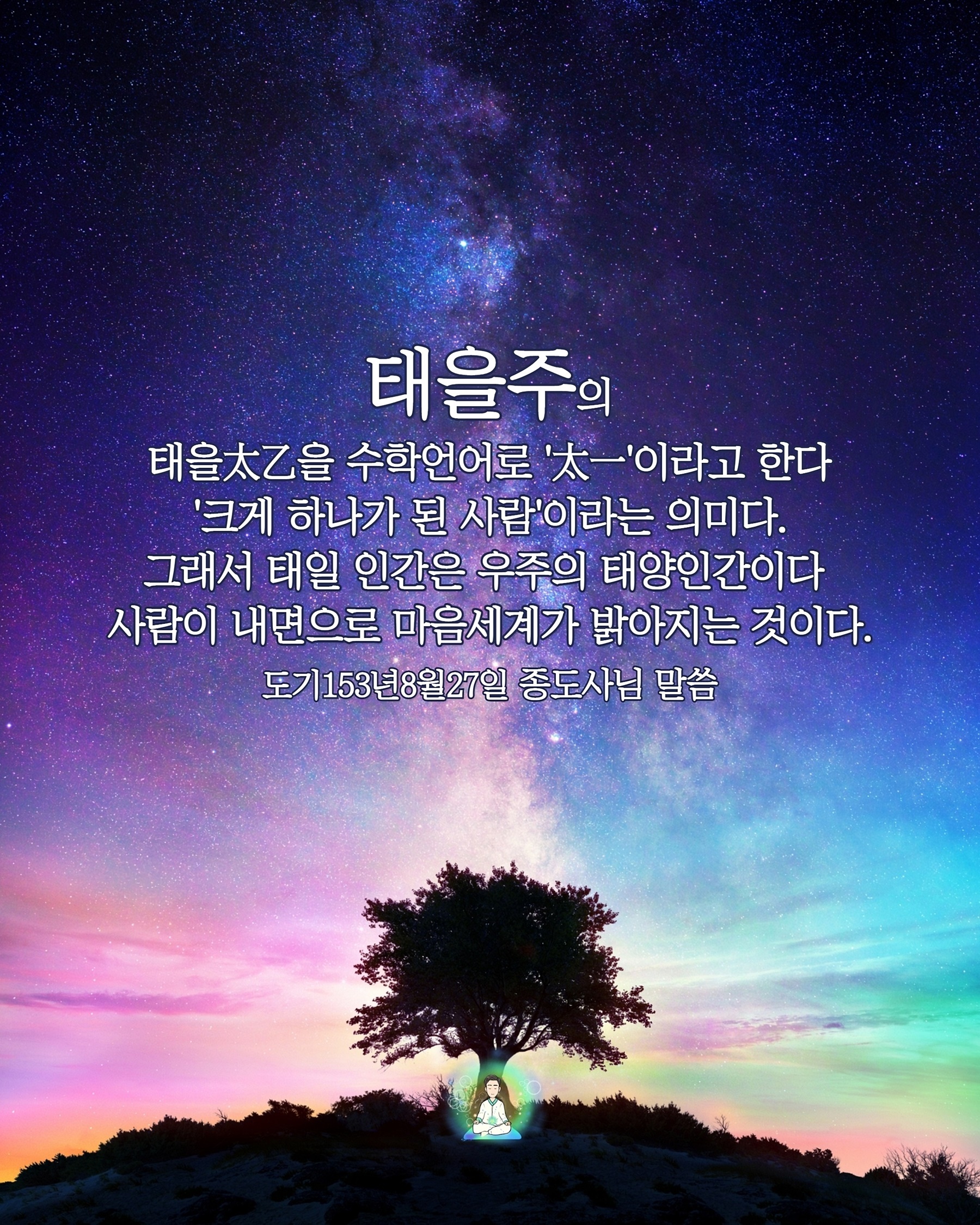 우주와 만유는 일체관계입니다. 인간 내면의 깊은 곳이 있는 존재의 근원은 곧 우주의 참모습입니다. 인간 본연의 참모습, 우주 본연의 참모습으로 돌아가는 것이 진정한 자유이고 평화이며 생사를 넘어서는 깨달음입니다.