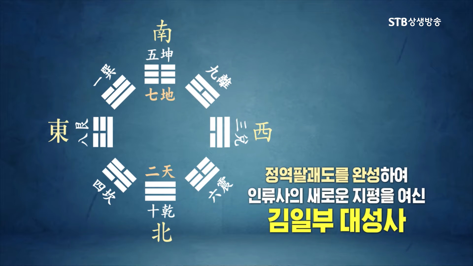 김일부 대성사는 우주가 태어나고 변화하는 과정을 그린 복희팔괘도와 문왕팔괘도의 역사를 거쳐 우주가 완성되는 정역팔괘도를 그려 역학대계(易學大系)를 완성했습니다. 김일부 대성사는 <정역>을 통해 선천의 주역 시대에서 후천의 정역 시대로 대전환하는 우주 변화의 이치를 밝혀놓았습니다.