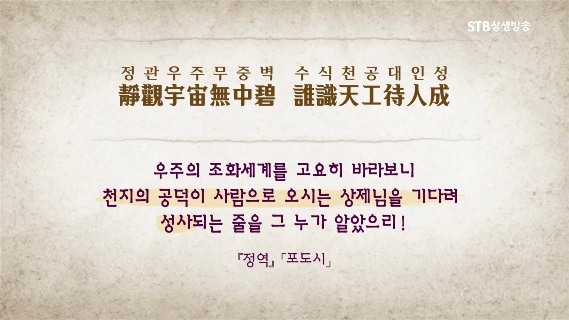 "개벽 세계여 새 세계여 상제님께서 성령의 빛을 뿌리며 친히 강세하시도다.", "우주의 조화세계를 고요히 바라보니 천지의 공덕이 인간으로 오시는 상제님을 기다려 성사되는 것을 누가 알았으리오!" 등 김일부 대성사는 <정역>에서 우주가 선천에서 후천으로넘어가는 때를 맞아 상제님께서 인간으로 강세하신다는 것을 밝혀놓았습니다.