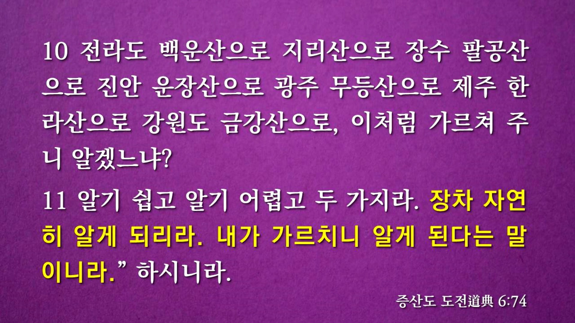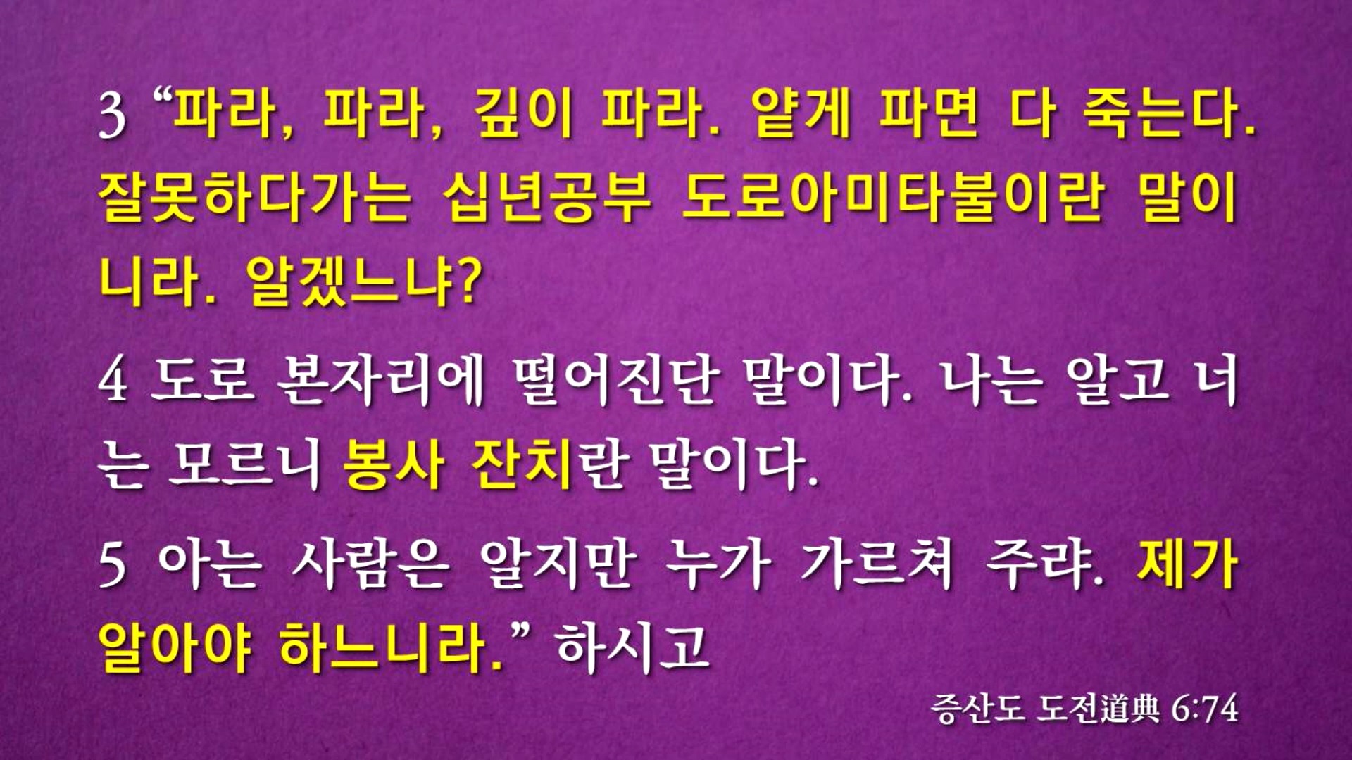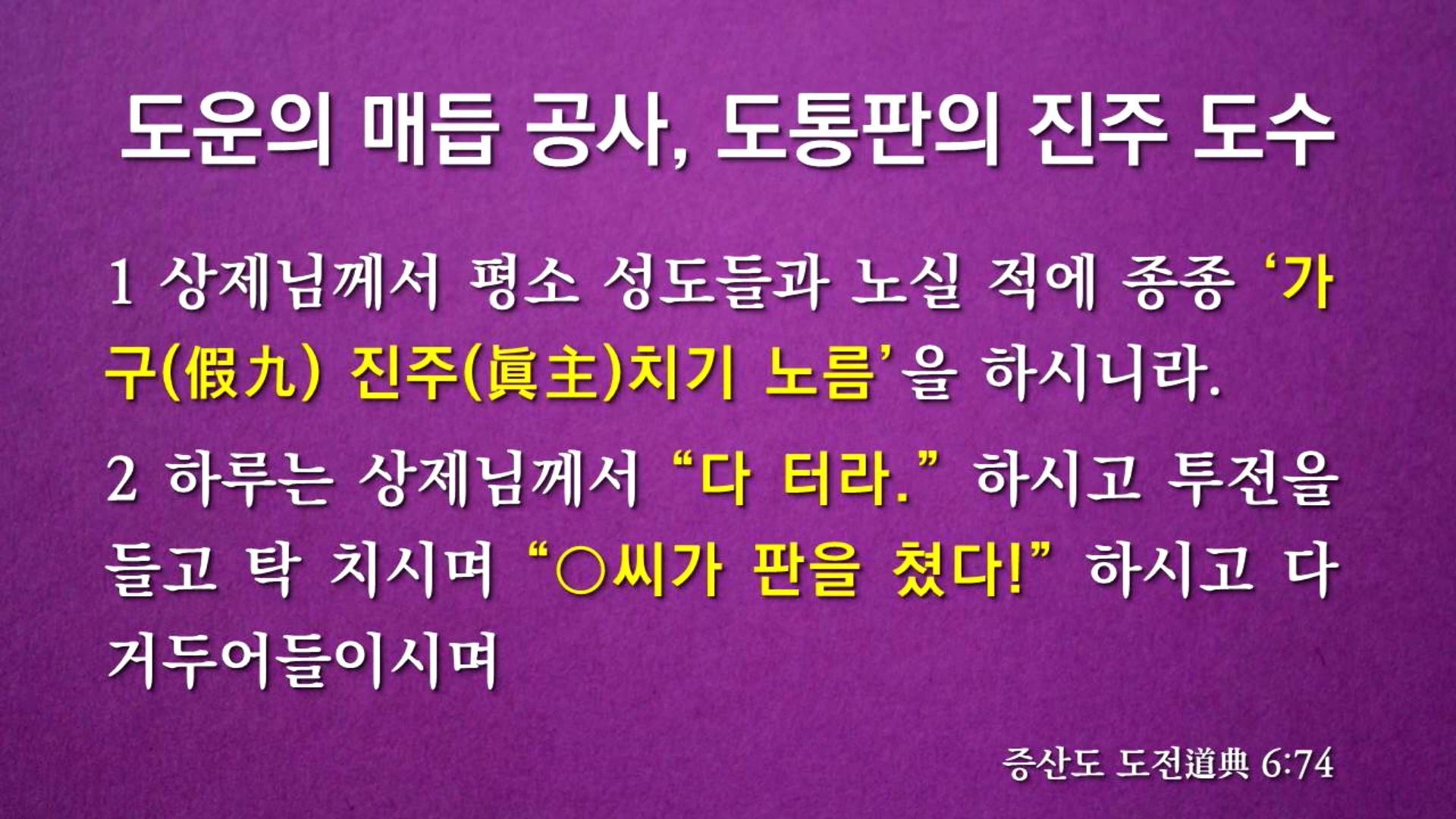 "현하대세가 가구(假九)판 노름과 같으니 같은 끗수에 말수가 먹느니라.", "진주(眞主) 노름에 독조사라는 것이 있어 남의 돈은 따 보지 못하고 제 돈만 잃어 바닥이 난 뒤에 개평을 뜯어 새벽녘에 회복하는 수가 있으니 같은 끗수에 말수가 먹느니라."고 말씀하셨습니다. 상제님 도(道)의 역사를 추수하는 대행자, 매듭짓는 진리의 주인공이 역사의 전면에 등장하는 과정을 노름판에 비유하신 것입니다.