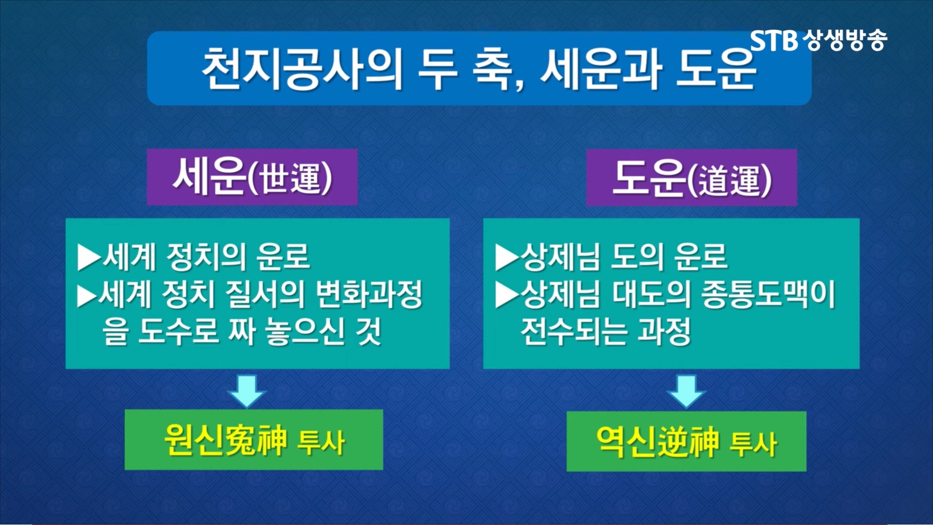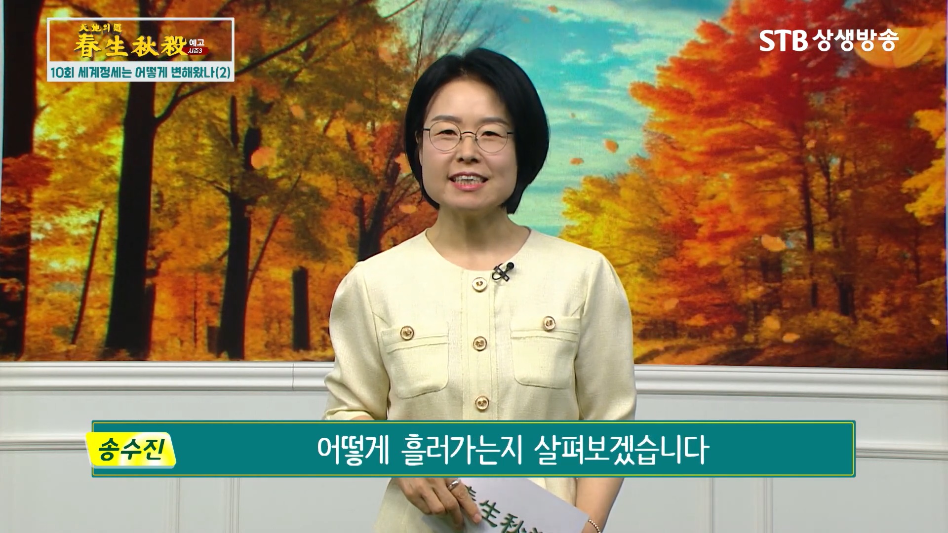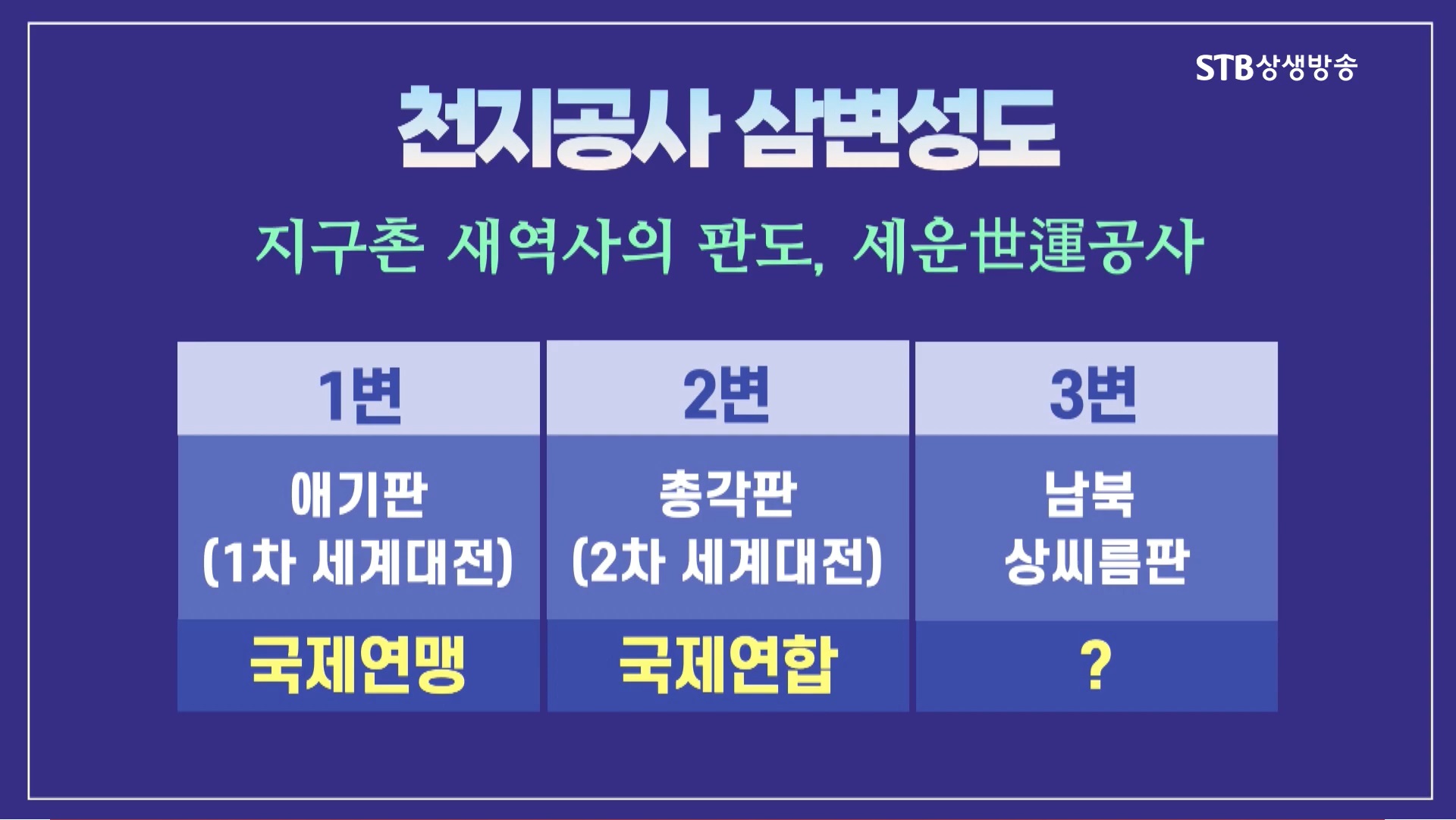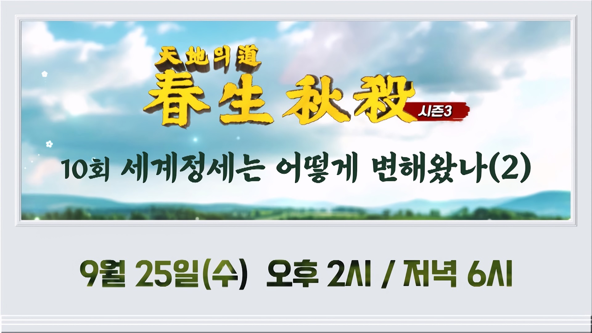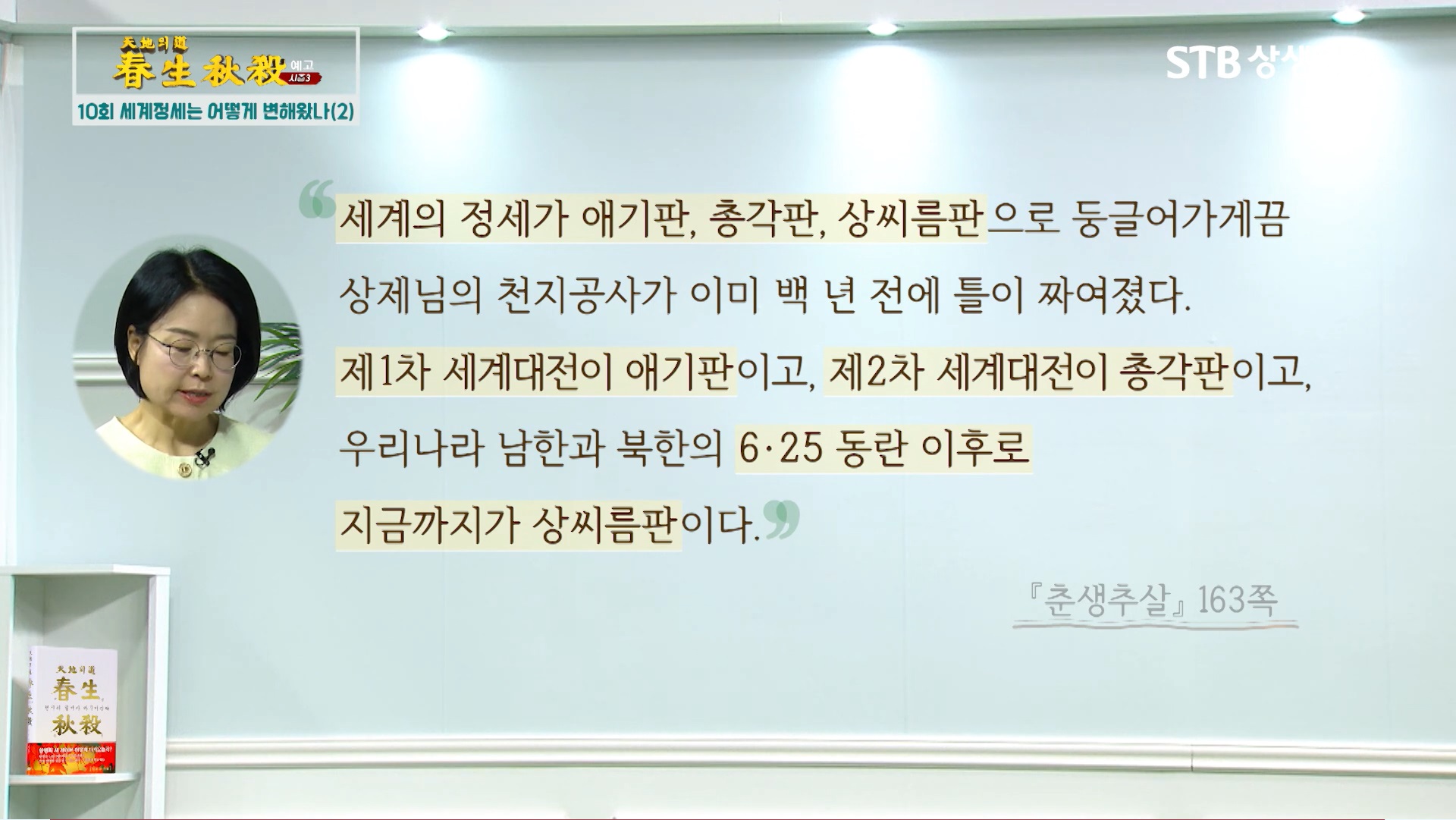 2024년 9월 25일 방영되는 증산도 STB상생방송 《천지의 도, 춘생추살 시즌3》 <10회 세계정세는 어떻게 변해왔나 2부>입니다. 제1차 세계대전과 제2차 세계대전은 이미 끝난 전쟁입니다. 그러나 3차 세계대전은 이철, 누리엘 루비니 등의 주장처럼 이미 시작된 전쟁이며 인류 문명사 최후의 전쟁입니다. 상제님의 천지공사를 보면 세상의 모든 전쟁의 시작과 종결되는 과정을 알 수 있습니다.