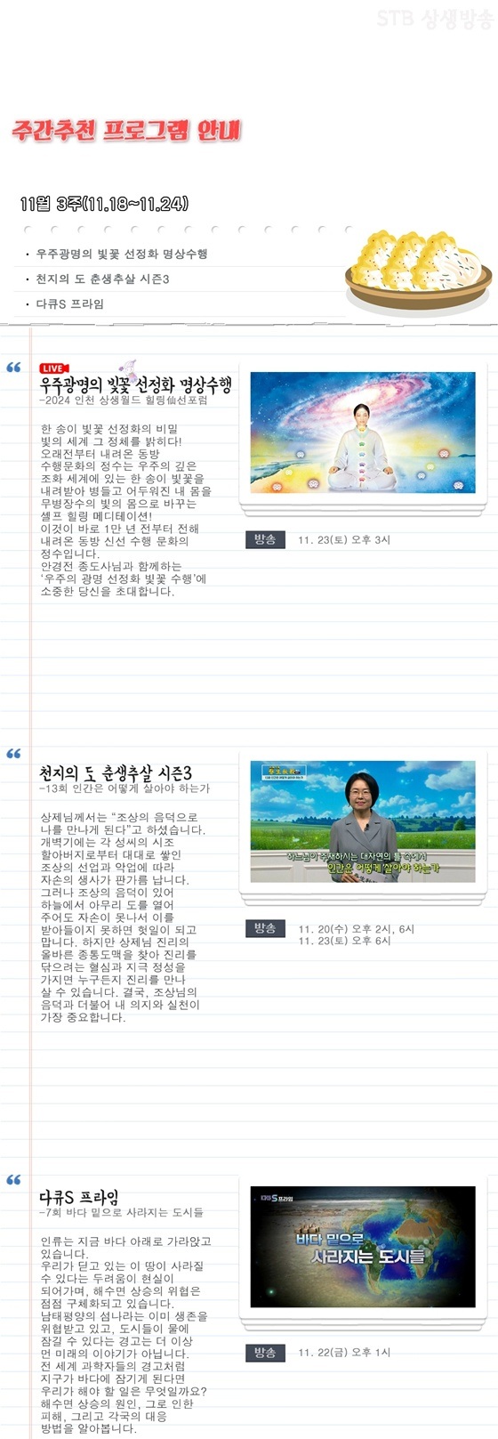 | 영성문화를 선도할 빛꽃 수행을 전해주는 증산도 상생방송 2024년 11월 1주 tv편성표 (49) | 2024.11.04 |