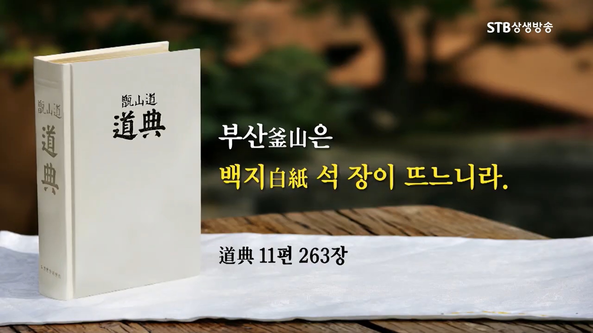 어머니 하나님이신 태모님께서는 "부산(釜山)은 백지(白紙) 석 장이 뜨느니라."라고 가을대개벽의 상황을 말씀하셨습니다. 2024년 11월 부산 벡스코에서 '개벽을 넘어 다 함께 빛의 시대로'라는 주제로 <개벽문화 북콘서트>가 개최됐습니다. '동래울산이 흐느적흐느적거린다', '부산은 백지 석 장이 뜬다'라는 말씀이 어떤 의미인지 큰 틀은 공개됐고, 자세한 내용은 증산도 전국 도장을 방문하여 자세하게 진리 상담을 하시기를 바랍니다.