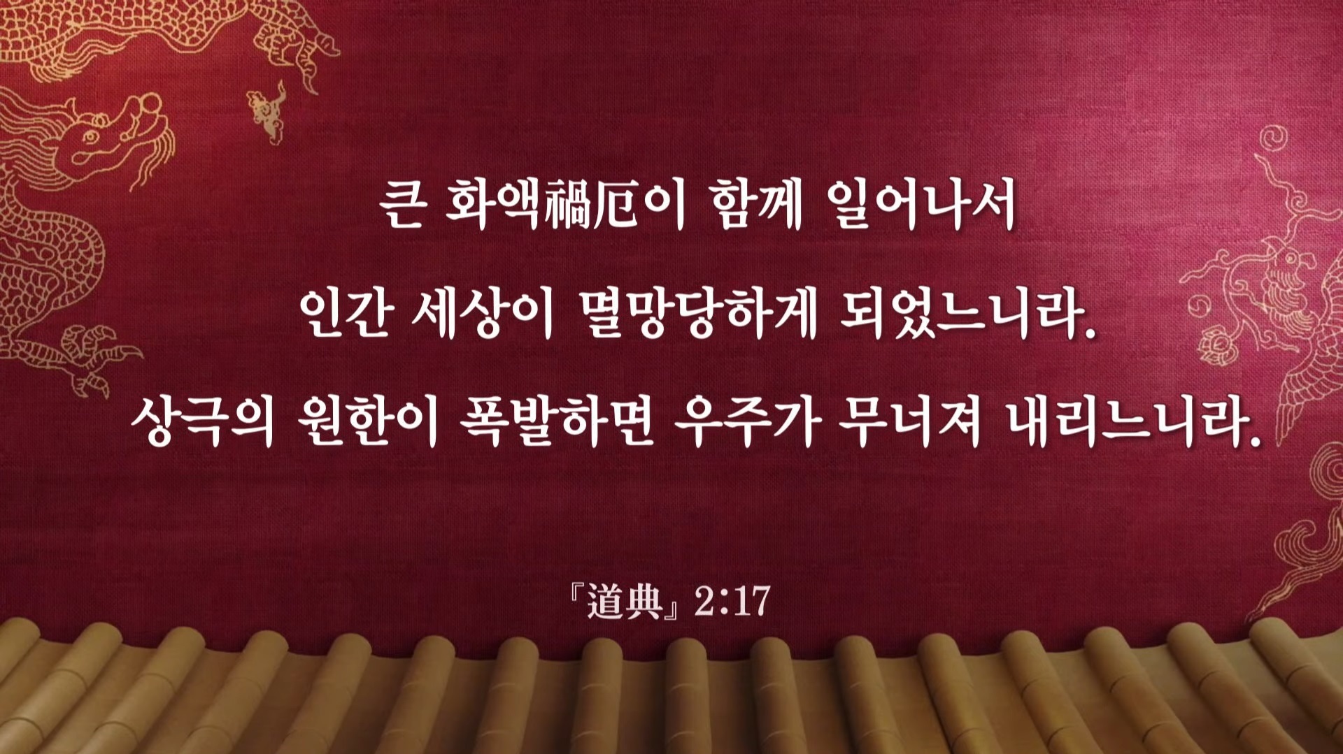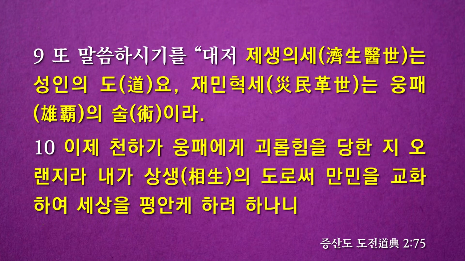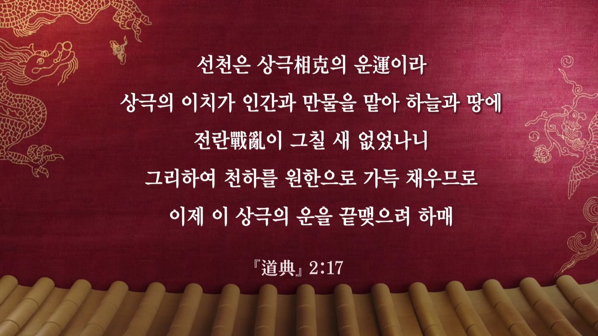 다시 말해 인간 세상에서 끊임없이 일어나는 대립과 갈등의 상극적인 문제들은 그 근원이 우주 질서라는 사실입니다. 대우주의 질서를 주재하시는 상제님께서 상극 질서로 돌아간 선천 5만의 끝자락에서 인간의 몸을 가지고 내려오셨습니다. 상제님께서는 갈등과 대립의 인간 사회의 상극문화를 해결할 상생문화를 전해주셨습니다.