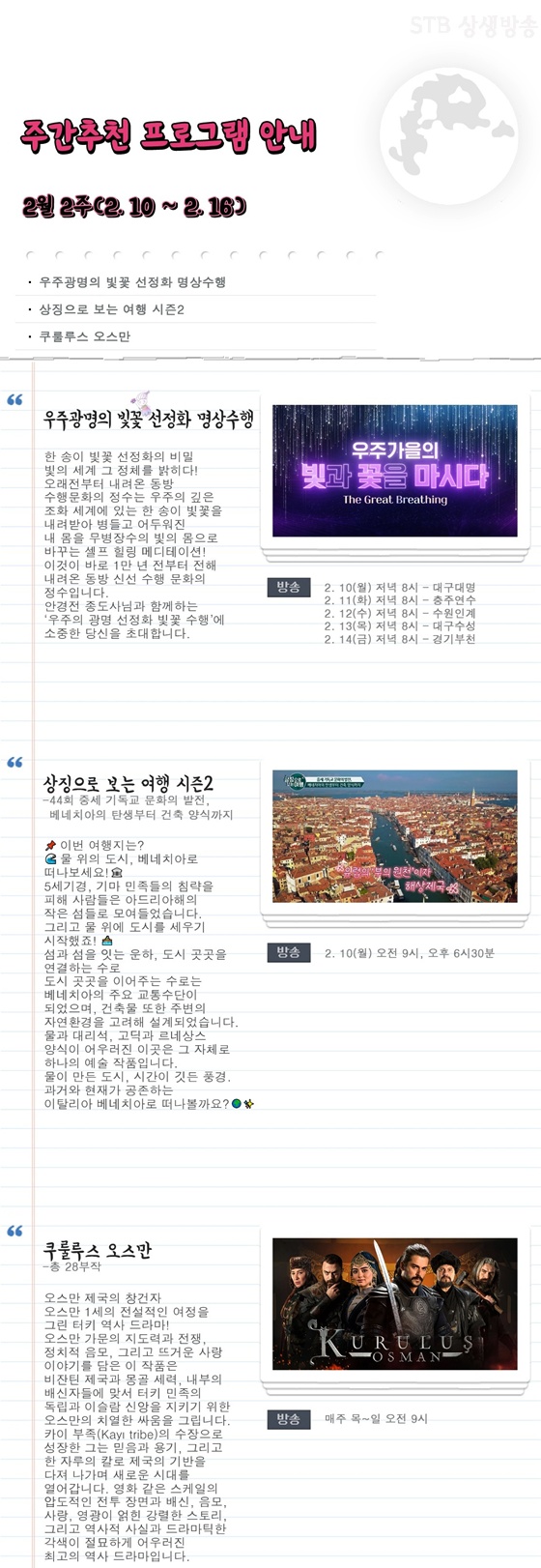 | 거대한 위기와 기회 문명대변혁의 시대를 대비하는 증산도 상생방송 2025년 2월 1주 tv편성표 (37) | 2025.02.03 |