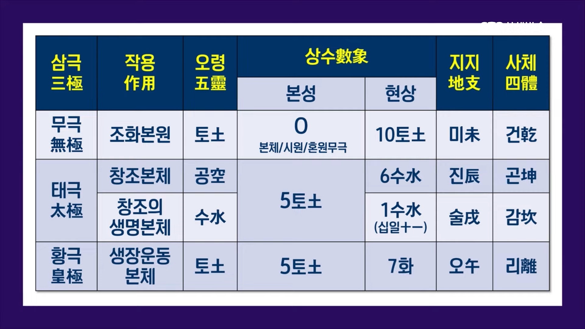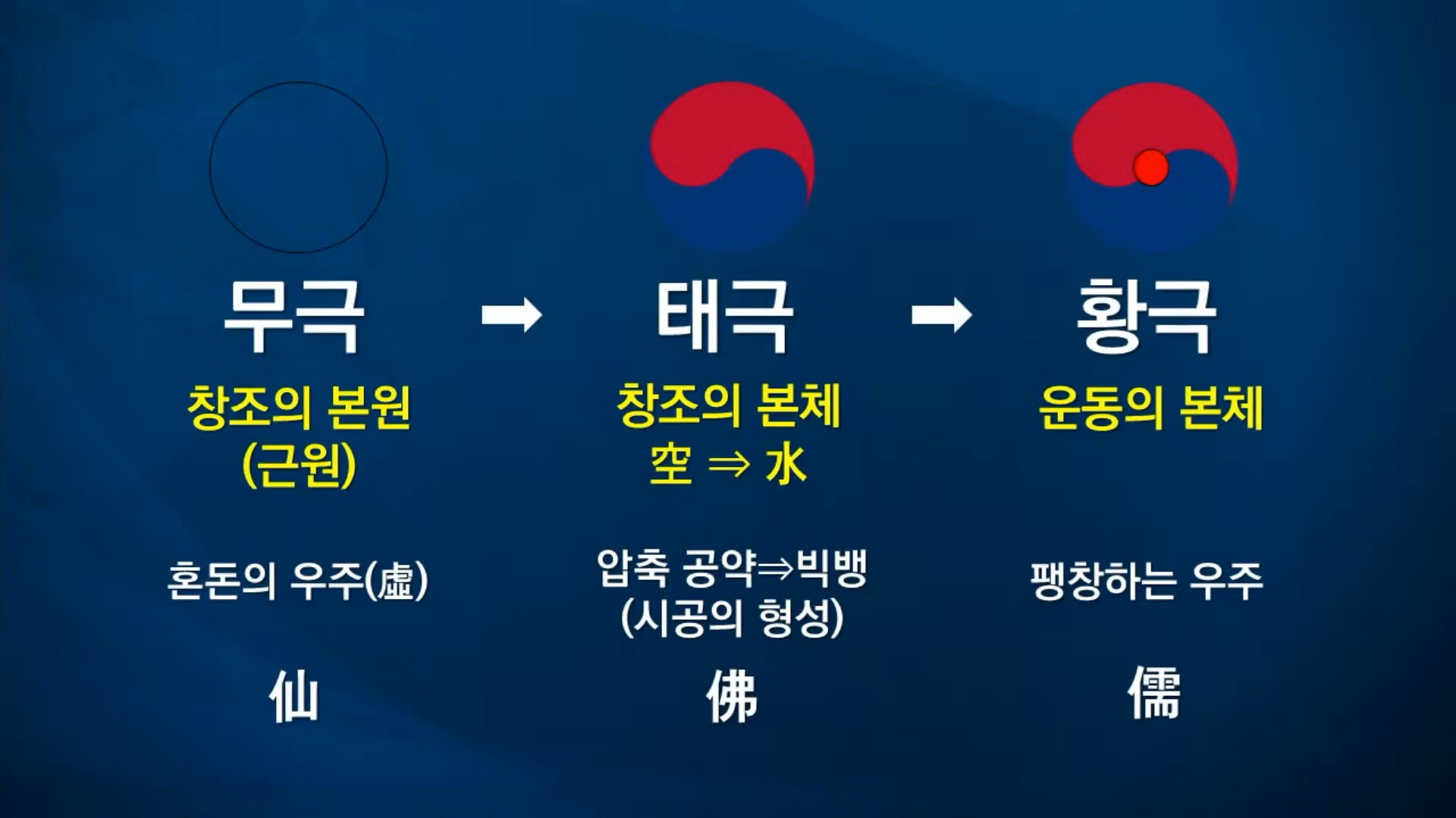 과학에서 말하는 '빅뱅'으로 열린 현실 세계의 절대 근원을 동양 삼극론(三極論)으로 말하면 본체 세계는 무극(無極)과 태극(太極), 현상세계를 황극(皇極)이라고 합니다. 현대과학은 우주의 시공간(時空間)이 시작되기 전(前) 본체 세계인 무극과 태극을 전혀 언급하지 못합니다. 현상 세계가 열리기 전의 본체 세계 절대근원 자리를 텅 빈 무(無)라고 생각하지만, 조화광명(造化光明)으로 꽉 차 있습니다.