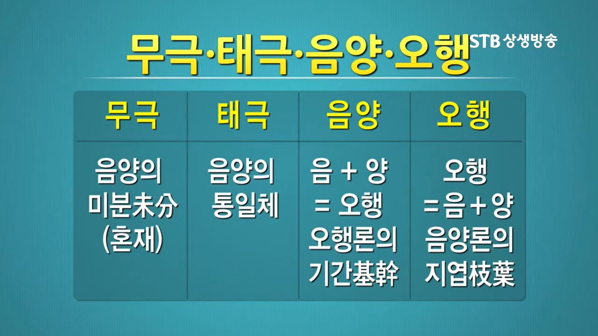 본체 세계인 무극은 다시 태극(太極)의 음(陰)과 양(陽)으로 분화하고, 본체 세계의 음양은 현상 세계 오행(五行)으로 분화하여 순환합니다. 우주 질서인 음과 양을 다른 말로 율려(律과 呂) 또는 상극(相克)과 상생(相生) 질서라고 합니다. 음과 양, 율과 여(율동여정律動呂靜), 상극과 상생은 겉과 속(안과 밖), 체(體)와 용(用)의 관계로 항상 동시에 일어납니다.