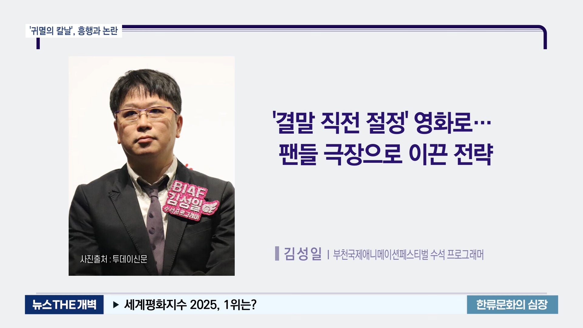 지금까지 일본 애니메이션 톱 5는 3,800여억 원의 흥행 수익을 올린 '귀멸의 칼날: 무한열차편'을 비롯하여 '귀멸의 칼날: 무한성편', '센과 치히로의 행방불명', '타이타닉', '겨울왕국' 등입니다. 애니메이션 영화 사상 최고 기록을 경신하고 있는 '귀멸의 칼날: 무한성편'은 2025년 8월 22일 우리나라에서 개봉한 누적 관객 수가 500만 명을 넘어섰습니다.