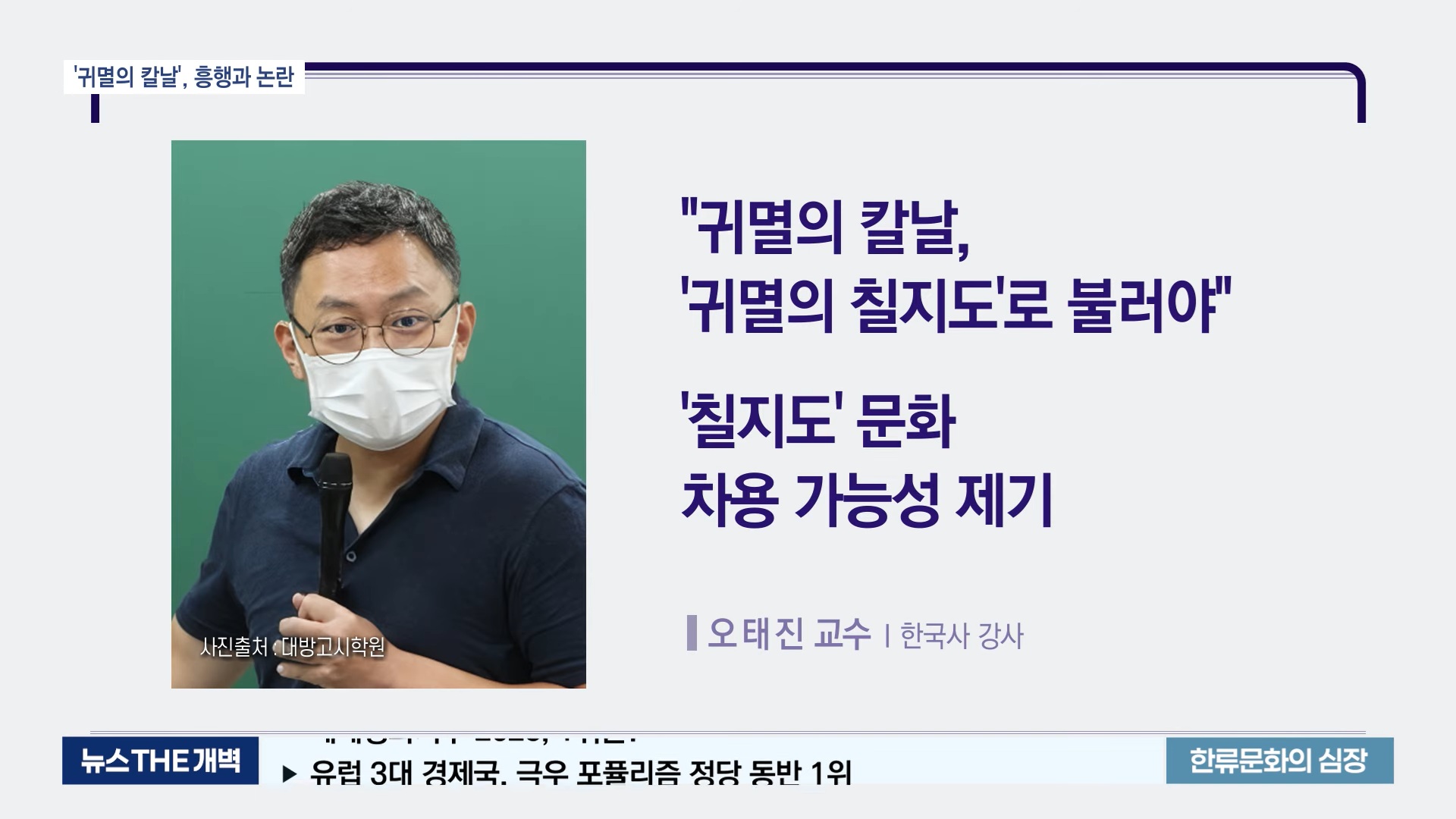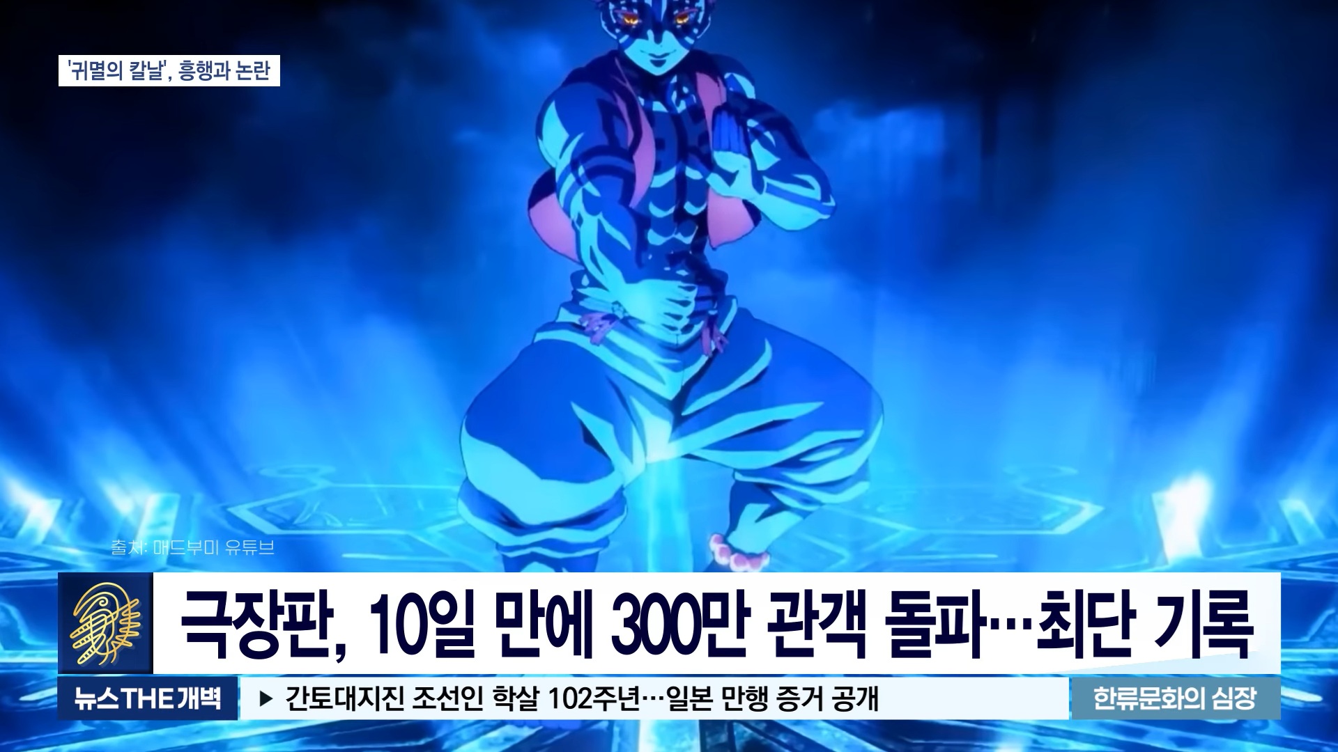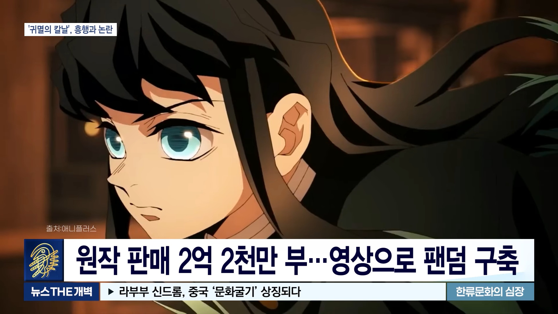 지식재산권(IP)을 비롯하여 애니메이션 영화, 굿즈, 음악 등의 '케데헌' 관련 수익을 독점한 넷플릭스는 향후 약 1조 4천억 원의 가치를 확보한 것으로 봅니다. '케데헌'의 내용은 한국 문화지만, 제작과 배급은 일본과 미국입니다. 일본은 애니메이션 대국입니다. '귀멸의 칼날'은 2016년 일본 '주간 소년 점프'에서 연재된 판타지 만화로, 2019년 애니메이션으로 제작되면서 흥행에 성공합니다.