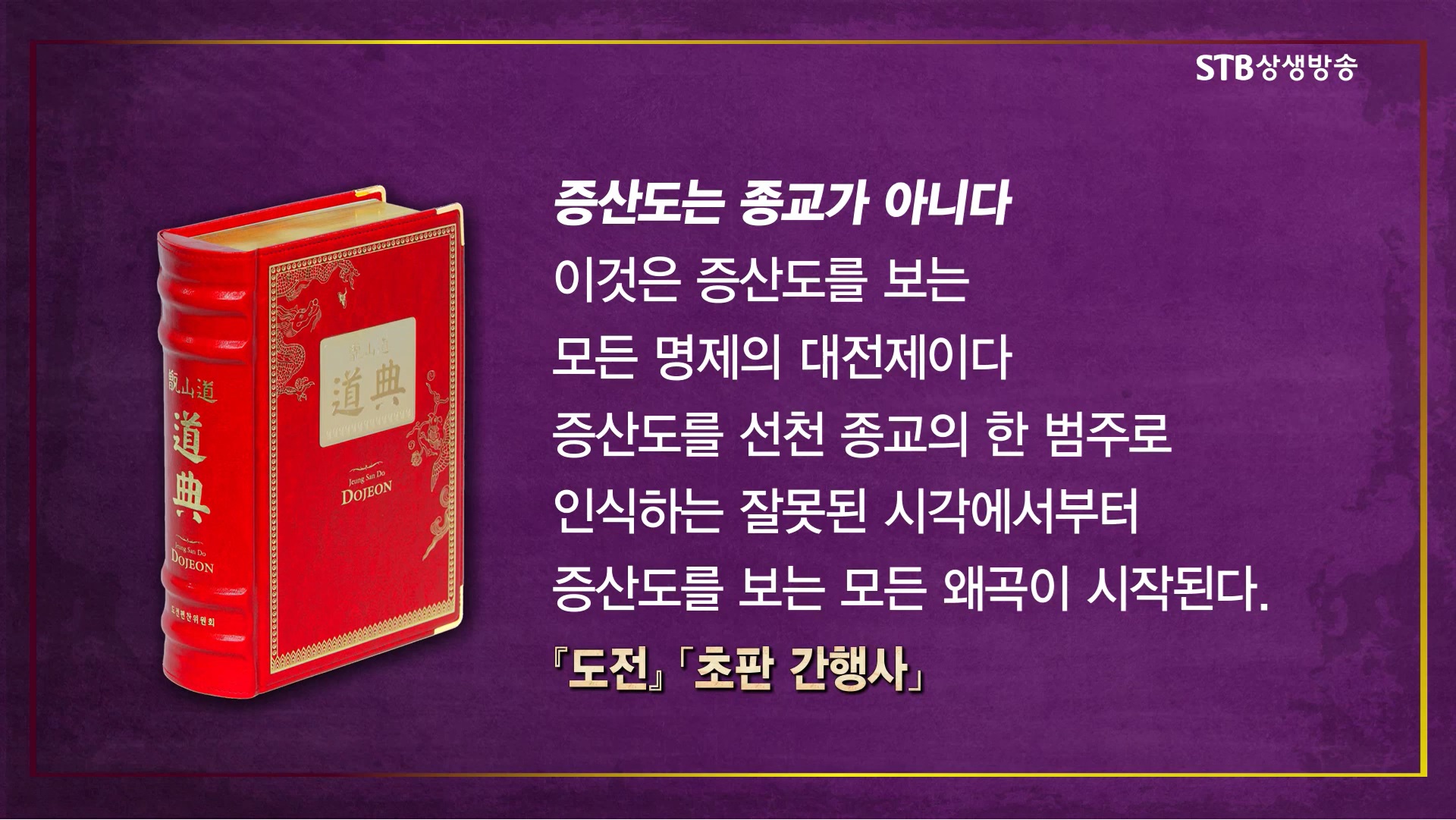 《증산도 대도문답大道問答》 서문 中 "'이 개벽기에는 판밖의 남모르는 법으로 새 세상을 연다'라는 증산 상제님의 성훈(聖訓) 말씀과 같이, 증산도는 이제까지 진리의 한 단면과 지엽에 매달려온 인류에게 구원의 생명을 열어주어 대도의 길로 우리의 영혼을 인도해 주고, 이 세상이 지금 어디와 와 있는지에 대해, 그리고 살길을 찾는 인간으로서 과연 무엇을 위해 생명을 바쳐야 할 때인가를 가르쳐 주고 있습니다...."