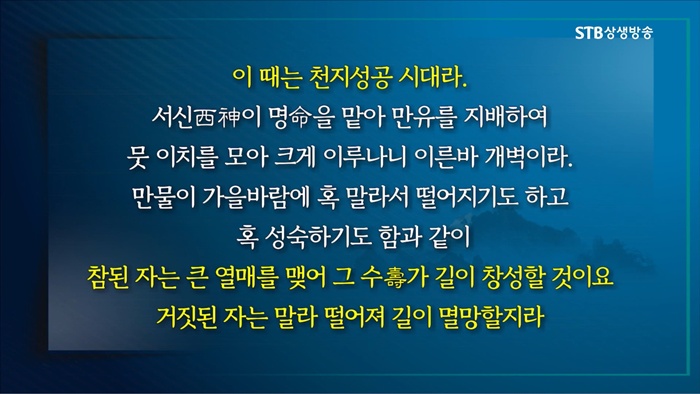 '통(統)'은 '거느리다'라는 의미와 함께 기강, 통일, 관리, 총괄, 실마리, 큰 줄기, 계통, 법, 우두머리, 근본, 시초, 벼리, 전부(모두) 등의 뜻도 있습니다. 우주 질서가 상극에서 상생으로, 우주 계절이 여름우주에서 가을우주로 넘어가는 가을(후천)개벽기에 인간으로 강세하신 우주 통치자 증산 상제님께서는 우주 사계절이 바뀌는 구체적인 변화성을 말씀해 주셨는데, 큰 법도와 기강은 다음과 같이 말씀해 주셨습니다.