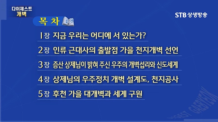 1986년 초판이 발행된 《다이제스트 개벽》에는 우주 통치자이신 증산 상제님께서 집행하신 인류구원 프로젝트이며 앞 세상 이정표인 천지공사(天地公事) 내용의 언어로 10년, 20년, 30년 등 인류 미래의 모습을 밝혀주고 있습니다. 《다이제스트 개벽》 핵무기 문제를 두고 남북한과 미국, 러시아, 중국, 일본이 함께 참여하는 이른바 '6자 회담'을 비롯하여 우주와 지구 대변혁 한반도 남북통일의 실상 등 다양한 내용을 담고 있습니다.