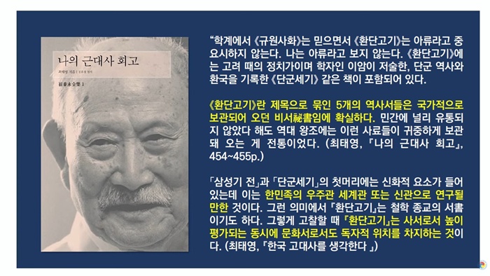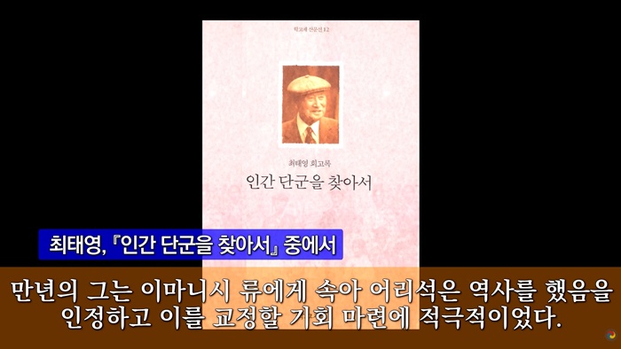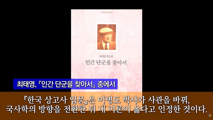 말년의 이병도는 최태영 박사가 3년 동안 끈질기게 설득한 끝에 자신이 견지해 온 일제 식민사학을 버리고 우리의 참역사를 세상에 알렸습니다. 옳든 그르든 평생을 역사학자로 살아온 이병도가 학교, 조선사편수회에서 배우고 습득한 일제 식민사학, 해방 후 교육부 장관과 대학교수로 자신이 세운 학설을 부정한다는 것은 자신의 모든 것을 포기하는 것과 같습니다.