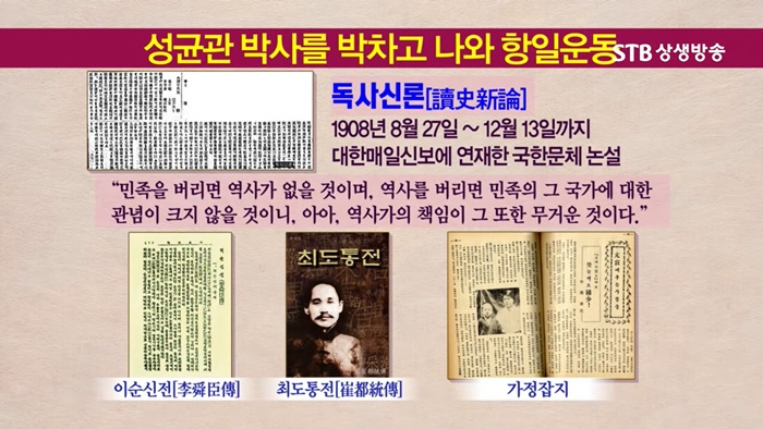 대한민국 교과서에는 잃어버린 한국사를 되찾아 국가의 완전한 독립과 민족의 자강을 추구했던 역사학자의 모습은 찾아보기 어렵고, 계몽과 투쟁과 혁명적인 독립운동가와 명언가라는 이미지만 부각되어 있습니다. 독립운동과 함께 역사 찾기를 병행했던 단재 신채호 선생과 백암 박은식 선생 등의 자주적인 한국사는 바로 독립운동가들의 역사관이기도 합니다.