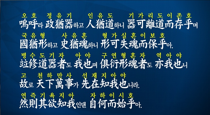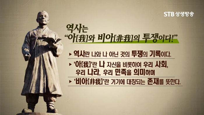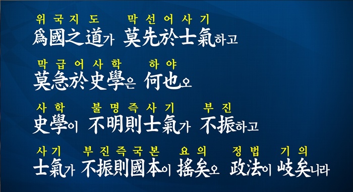 1908년 단재 신채호 선생께서 '대한매일신보'에 연재했던 <독사신론讀史新論>에 "무정신(無精神)의 역사(歷史)는 무정신의 민족을 낳으며, 무정신의 국가를 만들 것이니 어찌 두렵지 아니하리오!"라고 했습니다. <환단고기>의 <단군세기> 저자 고려말 수문하시중을 지낸 행촌 이암 선생은 "나라는 형체와 같고 역사는 혼과 같으니, 형체가 그 혼을 잃고서 어찌 보존될 수 있겠는가."라고 하셨습니다.
