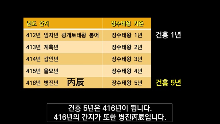 <환단고기>의 <고구려국본기>에 "장수홍제호태열제가 즉위하여 연호를 건흥(建興)으로 고쳤다."라고 명시되어 있습니다. '즉위년칭원법(卽位年稱元法)'에 따라 황제가 붕어(崩御)하고 새로운 황제가 즉위하면 원년(元年)으로 삼습니다. 광개토태왕께서 임자년(412)에 붕어하고 장수태왕께서 즉위하면서 '건흥'이라는 연호를 사용하면서 서력 412년은 '건흥 원년'이 됩니다. 제작 시기가 새겨진 한국에서 가장 오래된 금동 불상인 '건흥5년명 금동석가여래입상의 '건흥 5년'은 '서기 416년 병진년'입니다.