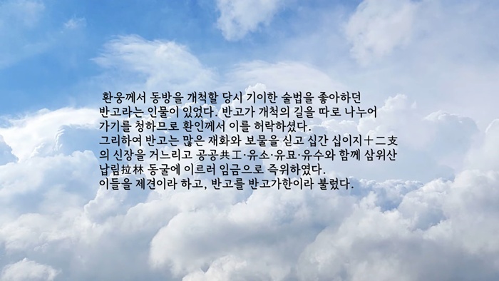 <환단고기>의 <삼성기 下>에서는 약 6,000년 전 배달국을 여신 초대 거발환 환웅천황이 동방 개척을 떠날 때 기이한 술법을 좋아하던 반고라는 인물이 환국의 마지막 환인 천제께 자기도 독립적으로 개척할 기회를 요청합니다. 환국의 마지막 7대 지위리 환인 천제께 승락받은 반고는 십간(十干)십이지(十二支)의 신장과 여러 사람을 이끌고 삼위산으로 이동해 임금이 되었다고 밝혀줍니다.