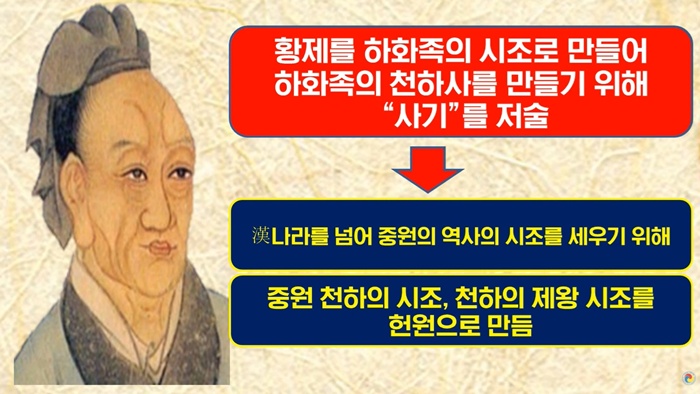<사기(史記)>는 전설상의 삼황오제(三皇五帝)에서 한나라 무제까지 기전체 형식으로 서술하고 있습니다. 그런데 사마천은 <사기>를 편찬할 때 삼황오제 중 삼황(三皇)은 빼버리고, 황제헌원으로 시작하는 오제(五帝)의 역사를 다룬 <오제본기五帝本紀>가 제1편입니다. 왜냐하면 세 분의 삼황(三皇) 중 첫 번째 인물이 배달국 5대 태우의 환웅천황의 12번째 아드님인 테호복희씨였기 때문입니다.