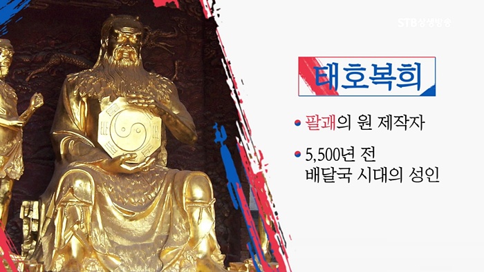 대한민국의 국기 태극기는 우주와 만물의 절대 근원과 생성과 변화의 법칙을 담고 있고, 중국의 국기인 오성홍기는 천문으로 우주의 중심을 상징합니다. 우리나라 국기인 태극기의 원조 태호복희씨는 약 5,500년 전 인물입니다. 태호복희씨는 배달국의 5대 태우의 환웅천황님의 막내 아드님입니다. 중국 하남성 회양현에는 반고와 함께 창조신화의 주인공이며 삼황오제 중 첫 번째 인물인 태호복희씨의 묘와 사당이 있습니다.
