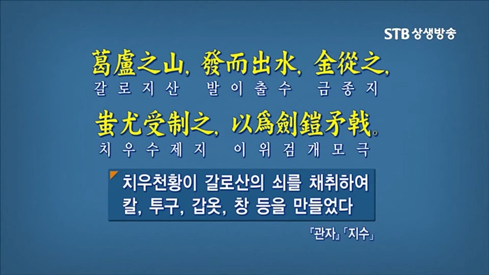 다시 말해 약 4,700년 전 중국의 황제헌원과 73번을 싸워 모두 이긴 자오지 치우천황은 금속문명의 선진 무기를 사용했다는 사실입니다. <환단고기>의 <삼성기 下>에서 "구리와 철로 투구를 만들어 쓰고 능히 안개를 일으키며 구치(九治)를 제작해 광석을 캐내고 철을 주조해 무기를 만드시니 천하가 크게 두려워하였다."라고 청동기시대에서 철기시대로 이어지는 금속 무기를 사용한 시대였음을 알 수 있습니다.