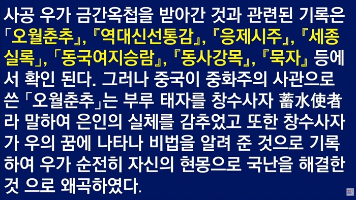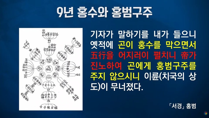 동방의 9년 대홍수를 다스렸다는 '치수(治水)'와 관련된 내용은 중국 문헌은 <오월춘추>, <송미자세가>, <서경> , <역대신선통감> 등, 우리나라 문헌은 <환단고기>와 <응제시주>, <세종실록>, <동국여지승람>, <동사강목> 등에 나옵니다. 고대 동방의 대제국인 단군조선의 초대 단군왕검께서 부루 태자를 보내 우나라 순임금에게 오행치수법(五行治水法)을 전해주었습니다. 중국 문헌은 사실을 왜곡했지만, 순임금은 오행치수법으로 치수(治水)에 성공했다고 기록하고 있습니다.